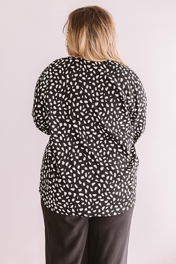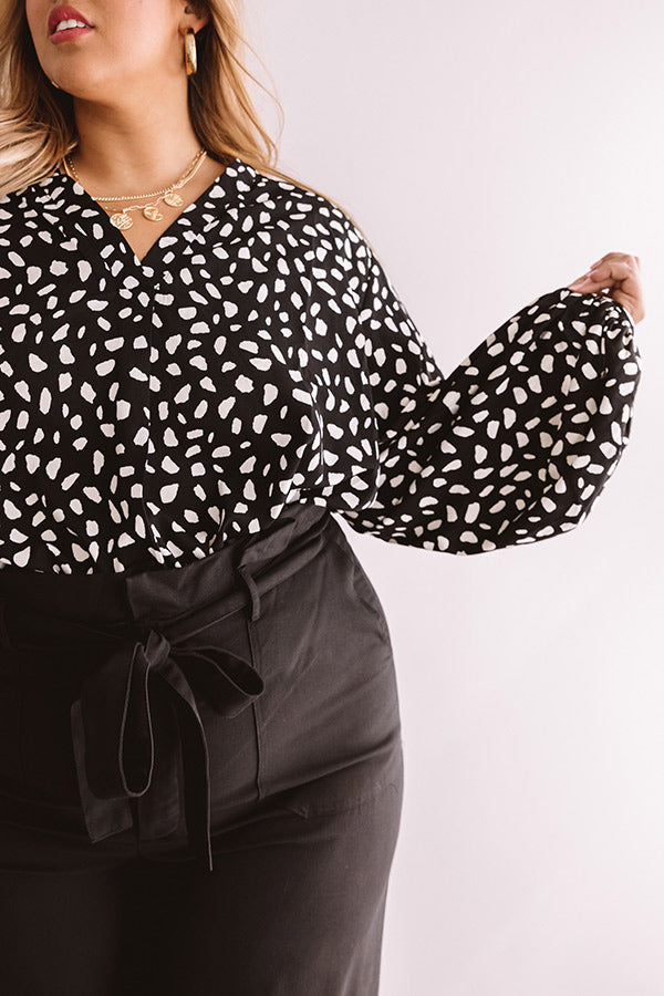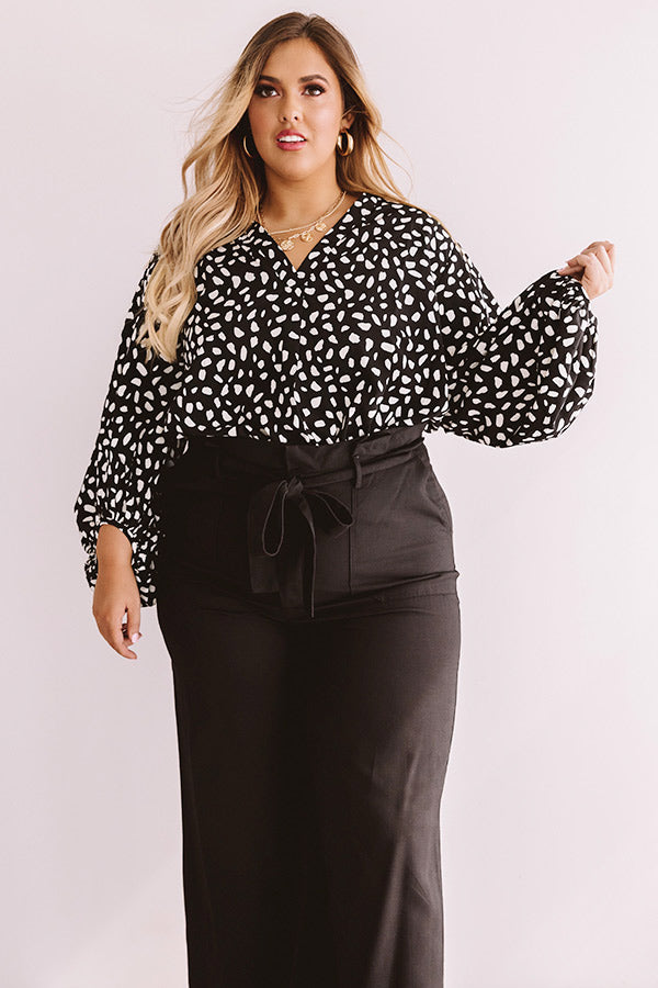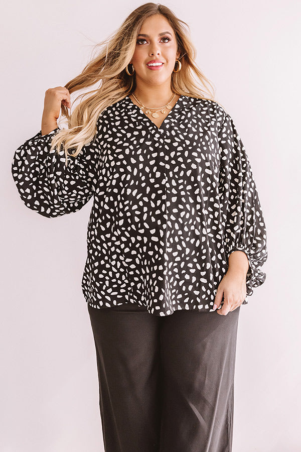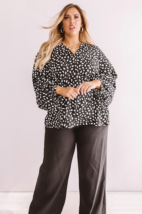 Plus Size - We have no doubt that this adorable little black shift top is going to be a "major craze" this fall with its lightweight material patterned with a black spotted print, a v-cut neckline, long oversized bishop sleeves with fitted elastic banded cuffs, and an ultra relaxed silhouette that falls into a straight hemline! We have styled this chic transitional piece for the work day with some black trousers, but you can also wear it more casually with some distressed ankle skinnies, "The Emmaline Bootie in Black," a faux suede hat, and "Our Jetset To Italy Tote in Black!" Measurements