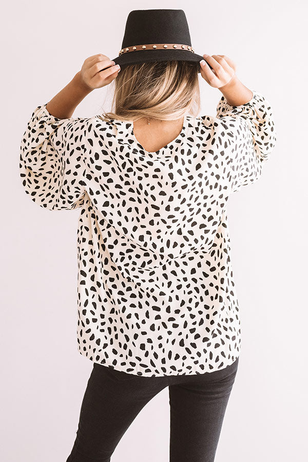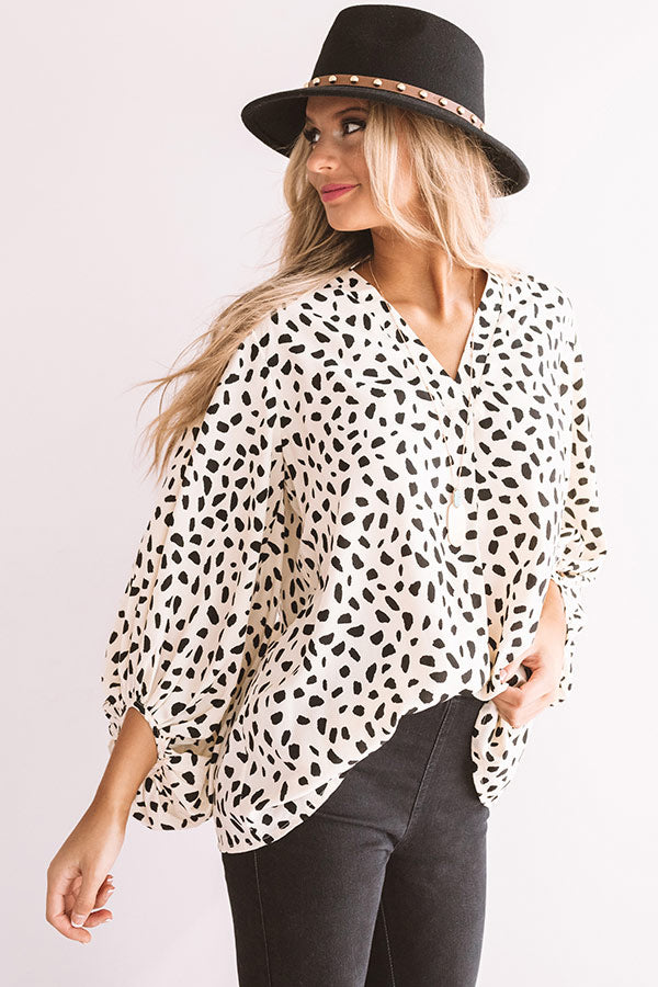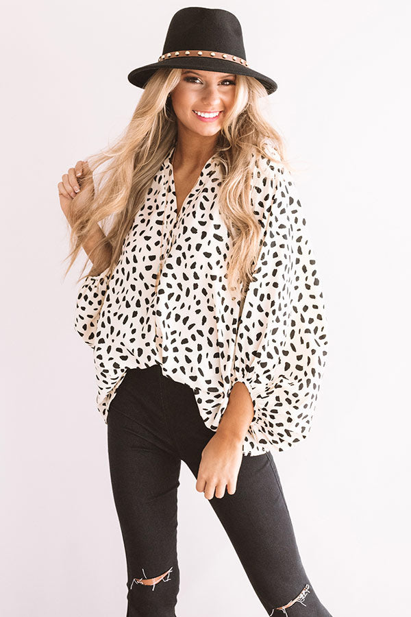 We have no doubt that this adorable cream colored shift top is going to be a "major craze" this fall with its lightweight material patterned with a black spotted print, a v-cut neckline, long oversized bishop sleeves with fitted elastic banded cuffs, and an ultra relaxed silhouette that falls into a straight hemline! This simple but significant transitional piece styles perfectly with some distressed black flares, a faux suede hat, and a neutral bootie and clutch, but you can also wear it with some frayed ankle skinnies and "The Jess Faux Suede Heel in Natural!" Measurements
