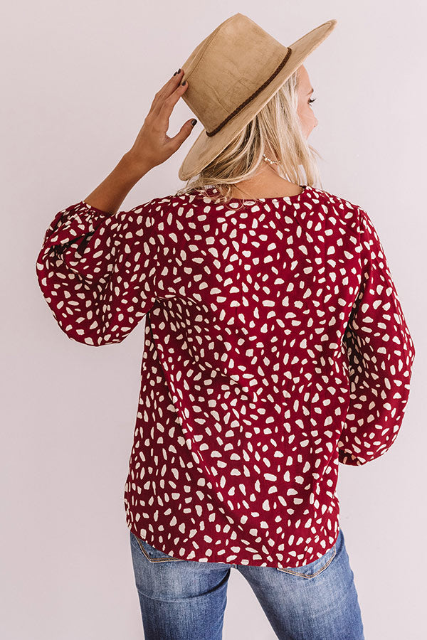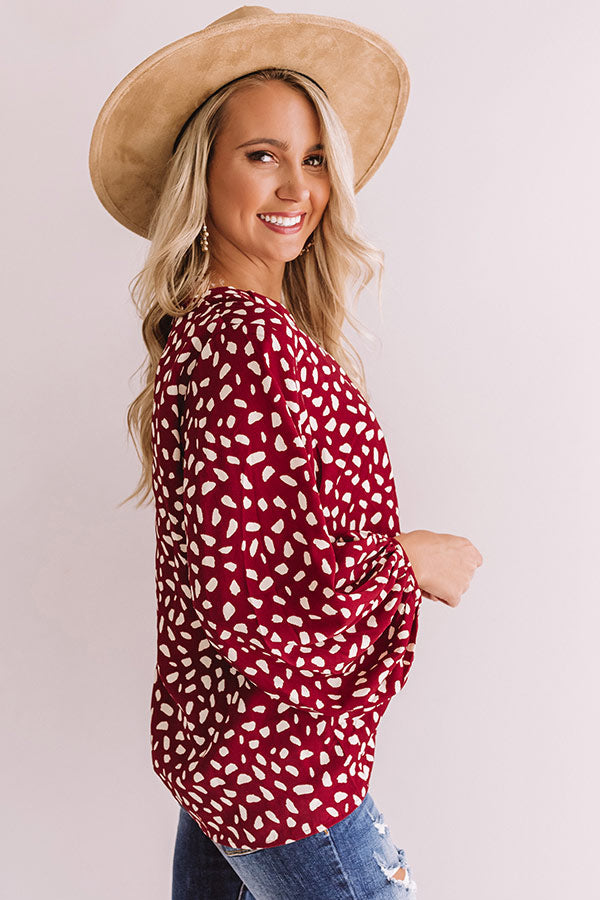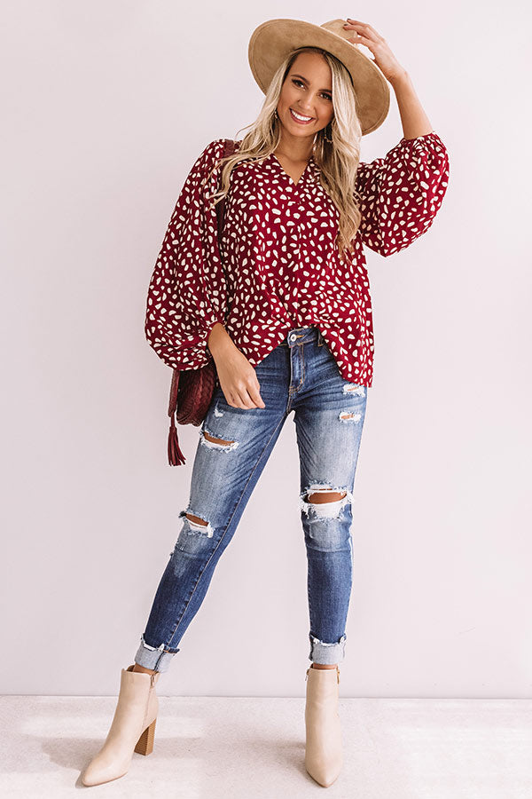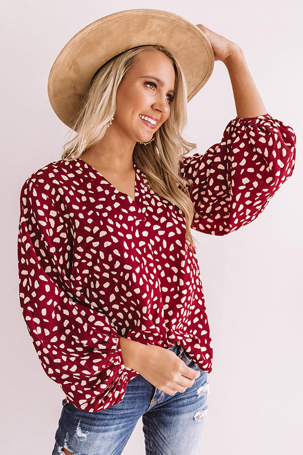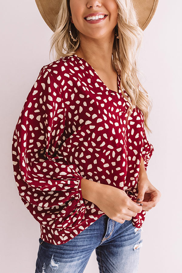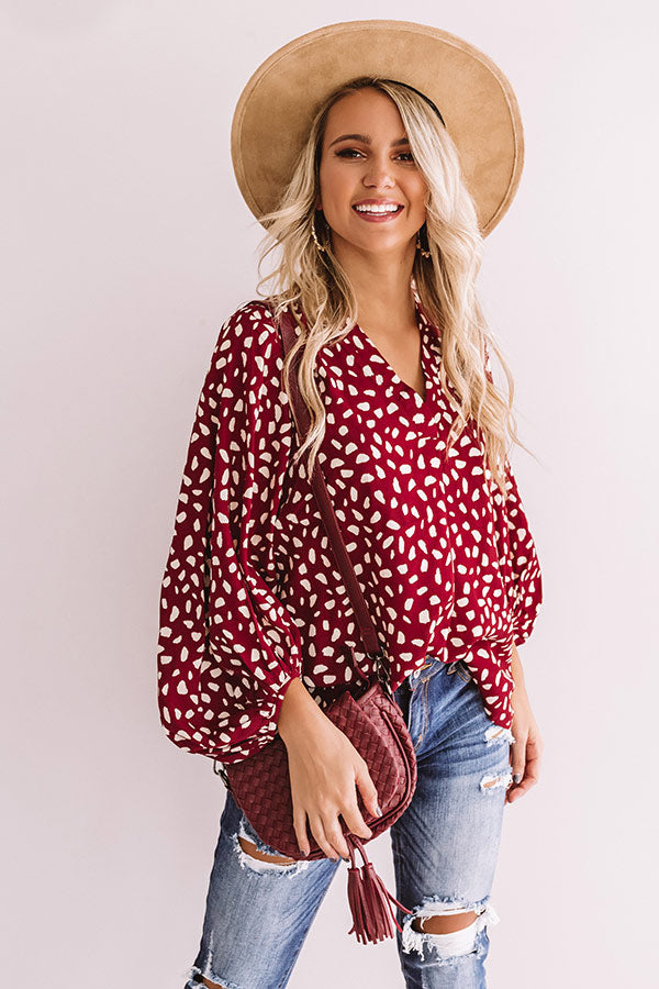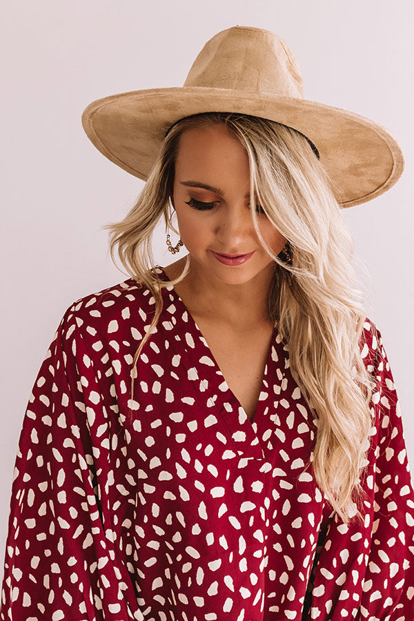We have no doubt that this adorable wine colored shift top is going to be a "major craze" this fall with its lightweight material patterned with a black spotted print, a v-cut neckline, long oversized bishop sleeves with fitted elastic banded cuffs, and an ultra relaxed silhouette that falls into a straight hemline! This simple but significant transitional piece styles perfectly with some distressed ankle skinnies, a matching crossbody, and a neutral bootie and faux suede hat, or with some charcoal flares and "The Jess Faux Suede Heel in Natural!" Measurements