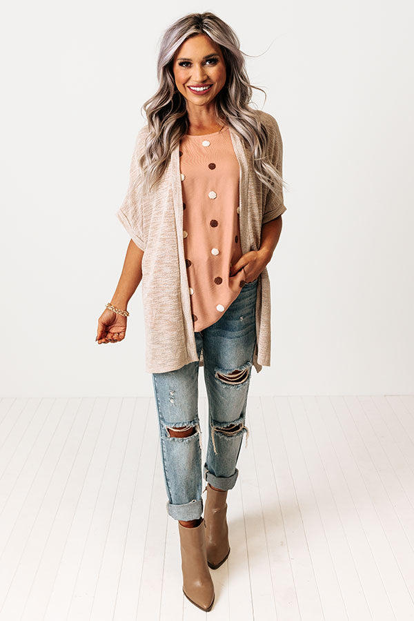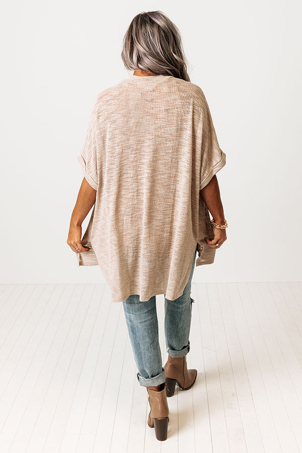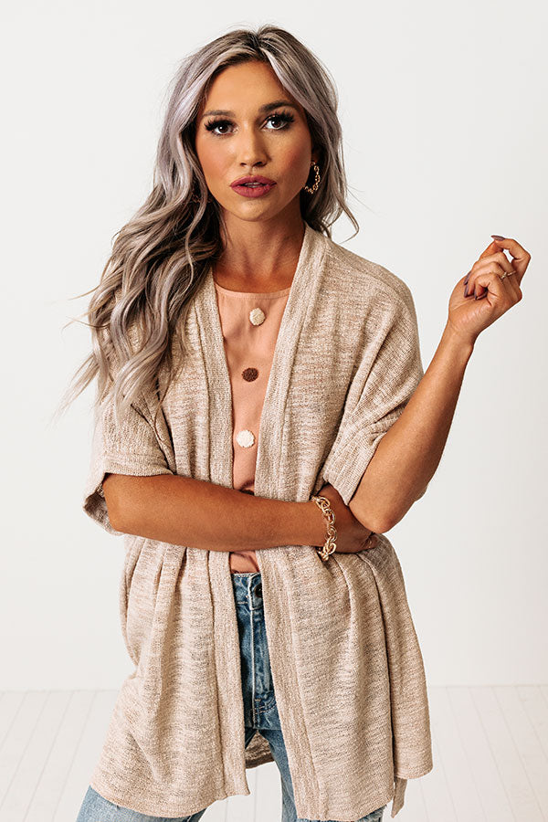 Layer up in style with our casual birch colored 'Major Milestone' cardigan featuring soft and lightweight tight knit material, oversized bat wing half sleeves with rolled cuffs, and a draped open front silhouette that cascades into a straight mid-thigh length hemline with accent side slits! Measurements