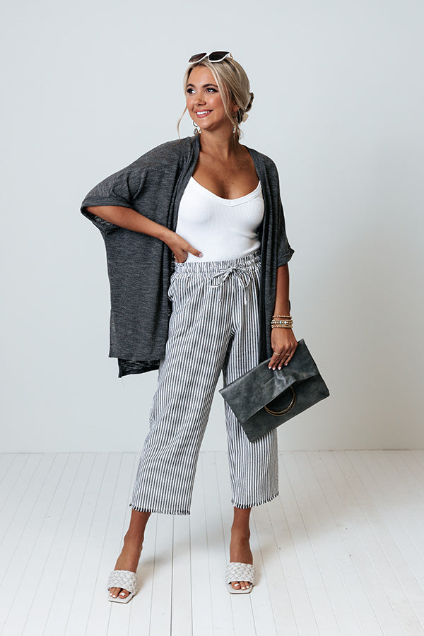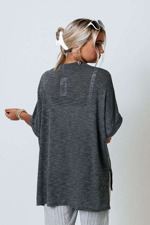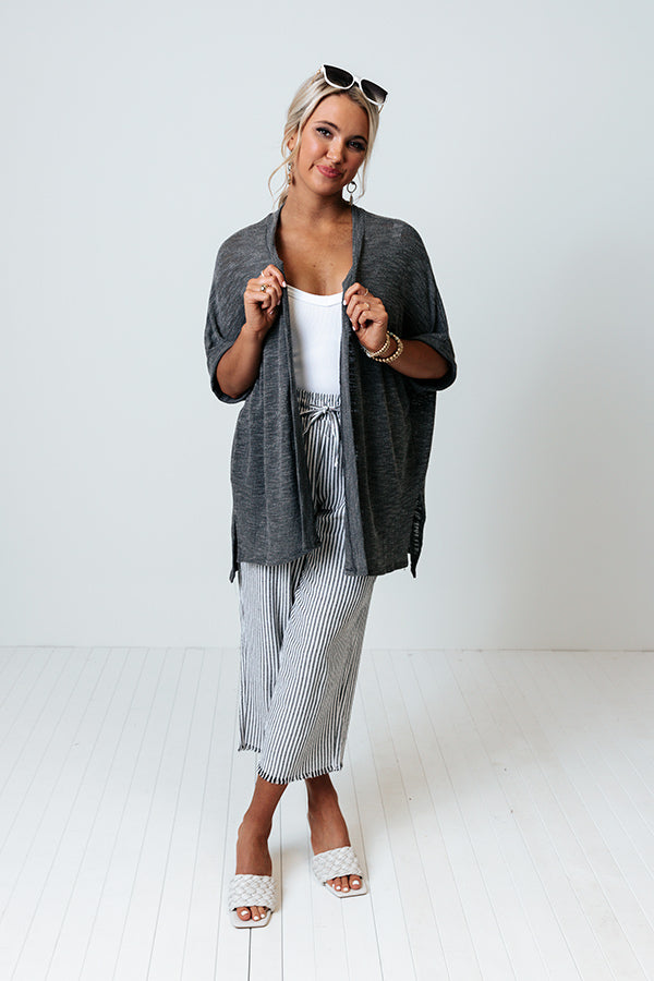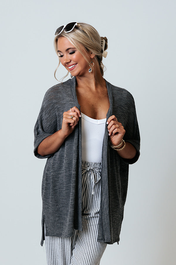 Layer up in style with our casual charcoal colored 'Major Milestone' cardigan featuring soft and lightweight tight knit material, oversized bat wing half sleeves with rolled cuffs, and a draped open front silhouette that cascades into a straight mid-thigh length hemline with accent side slits! Measurements