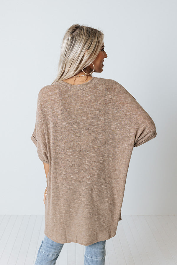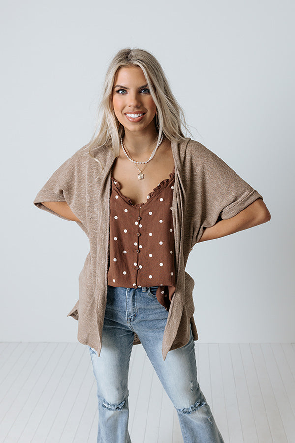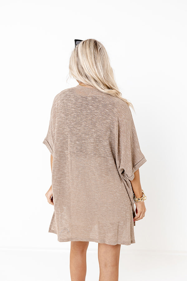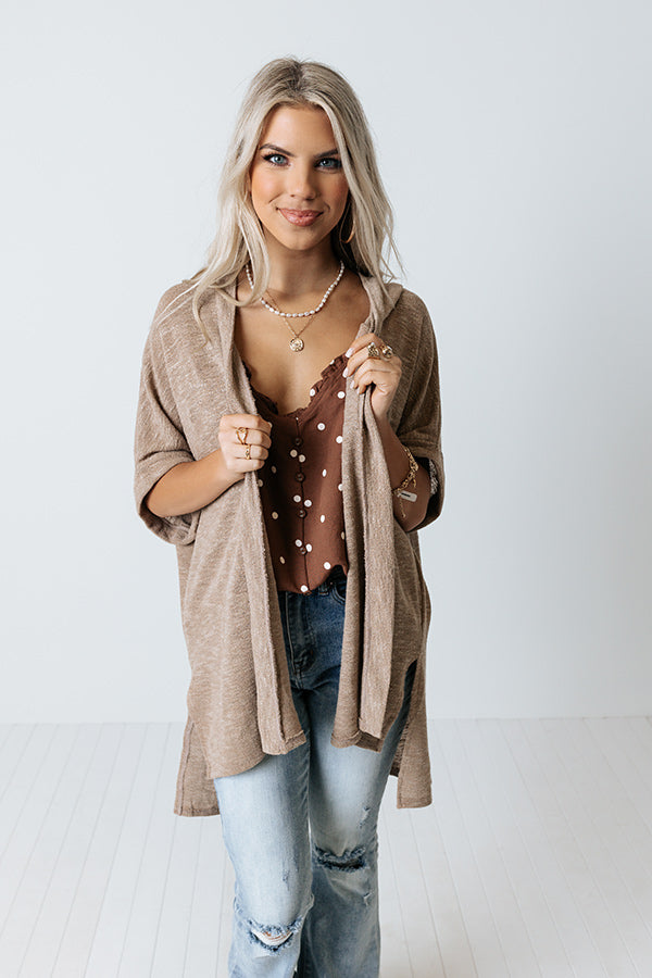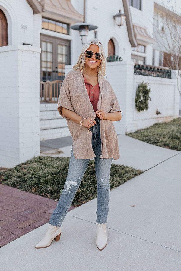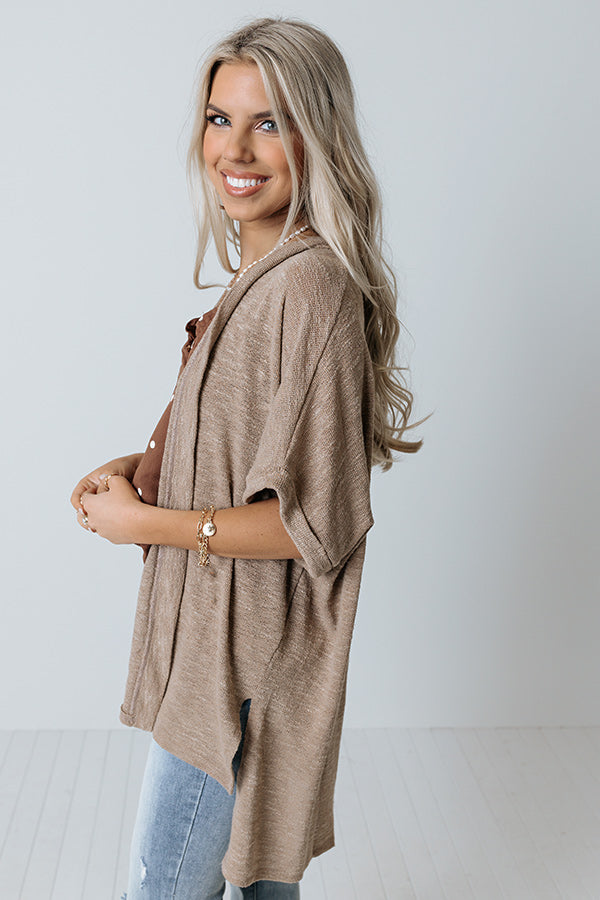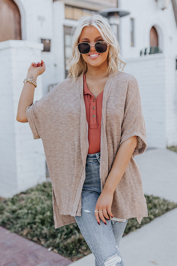 Layer up in style with our casual iced latte colored 'Major Milestone' cardigan featuring soft and lightweight tight knit material, oversized bat wing half sleeves with rolled cuffs, and a draped open front silhouette that cascades into a straight mid-thigh length hemline with accent side slits!