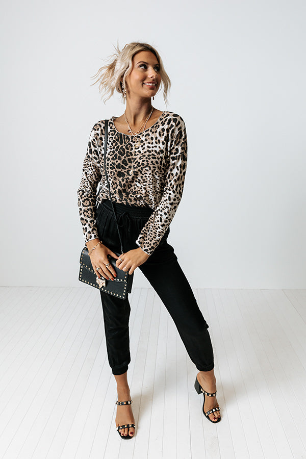 Give your wardrobe a major update with this adorable top featuring soft lightweight material patterned with a bold brown and black leopard print, a wide rounded neckline that can be worn off one shoulder, long form fitting sleeves with roll tab cuffs, and a figure flattering silhouette that falls into a rounded hemline!