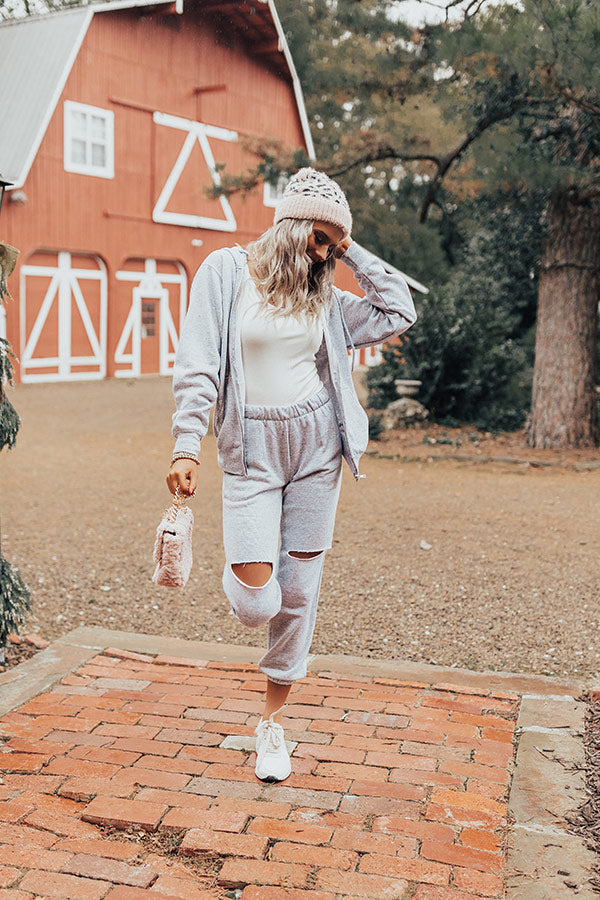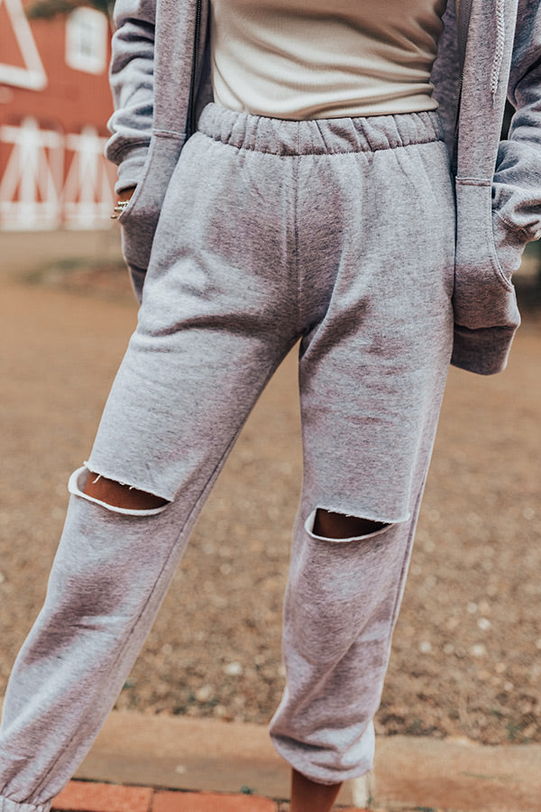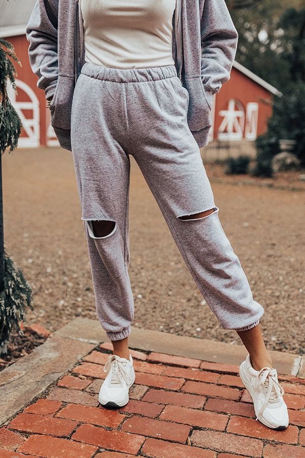 It will be a major fashion win when you wear these cozy grey joggers featuring soft and warm material with distressed knee detailing, an elastic waistline, hidden side pockets, and a slouched pants silhouette that tapers into fitted ankle-length hemlines! Measurements
