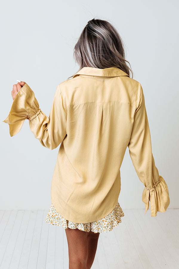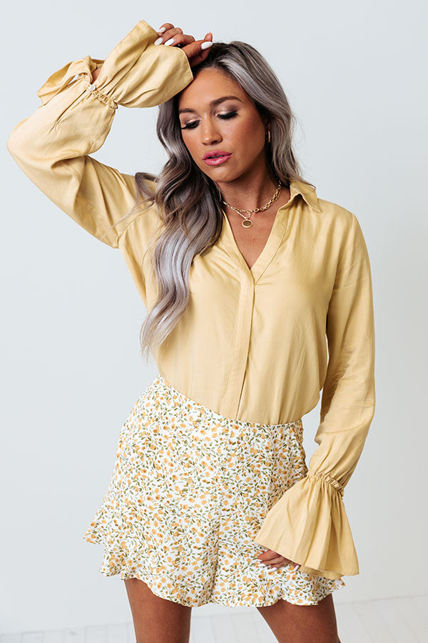 Take your look up a notch with our classy primrose yellow 'Make Amends' top featuring lightweight material, a button up front with a short collared v-cut neckline, long loose bishop sleeves with flared cuffs, and a sophisticated silhouette that ends in a rounded hemline!