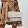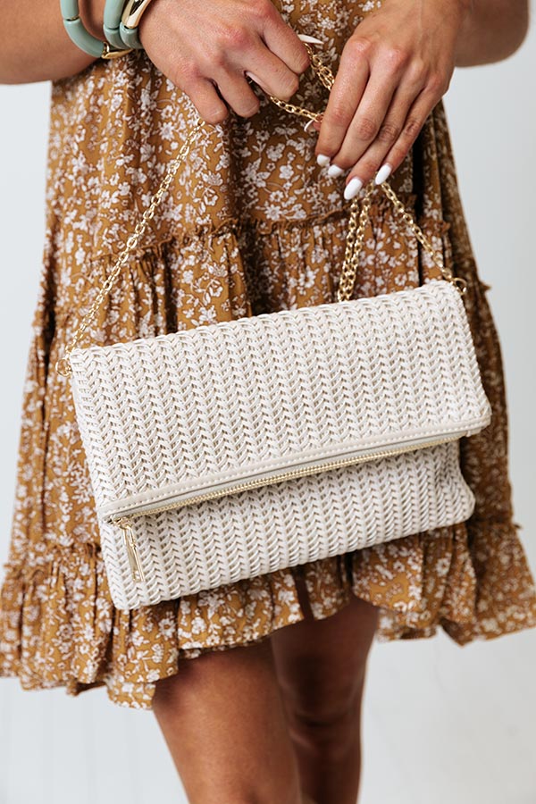 Take your look to the next level with our cute birch hued 'Make Amends Clutch' featuring woven material, a removable gold chain shoulder strap, a flap silhouette with a zip closure and snap buttons, and a spacious fully lined rectangular pouch!