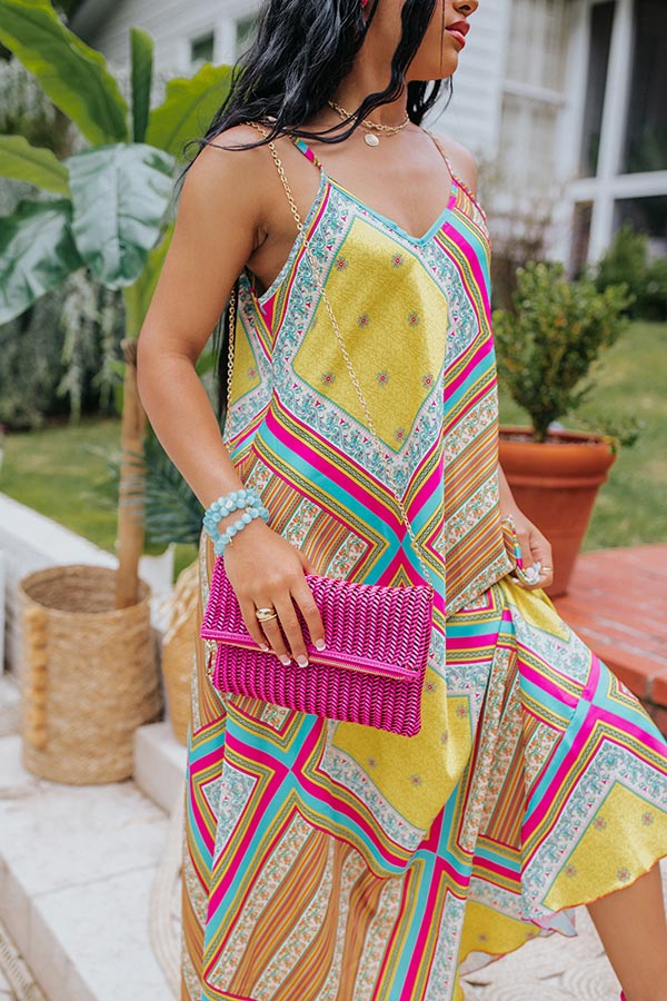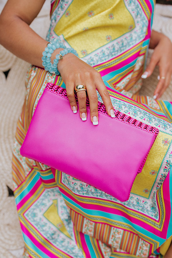 Take your look to the next level with our cute orchid hued 'Make Amends Clutch' featuring woven material, a removable gold chain shoulder strap, a flap silhouette with a zip closure and snap buttons, and a spacious fully lined rectangular pouch!