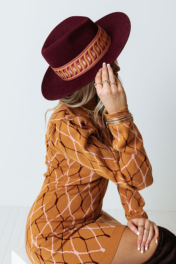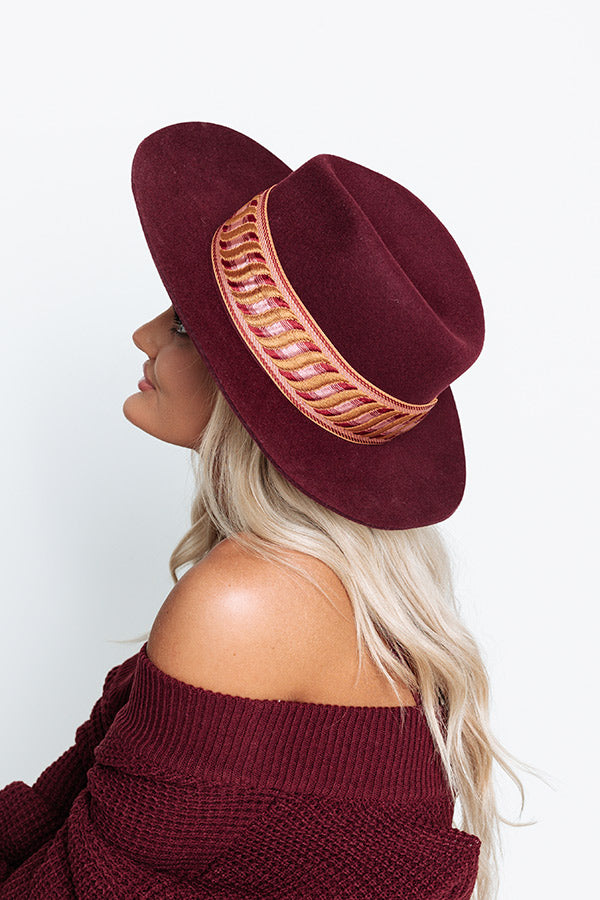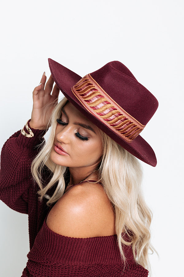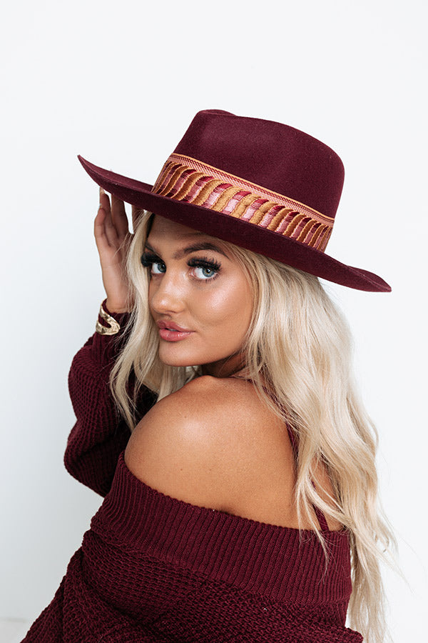 Make a statement in our eye-catching wine colored 'Make Amends' fedora featuring lightweight wool material, a curved 3-inch brim, and a wide embroidered accent band!