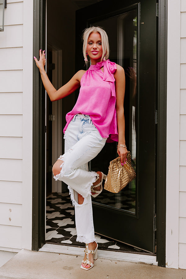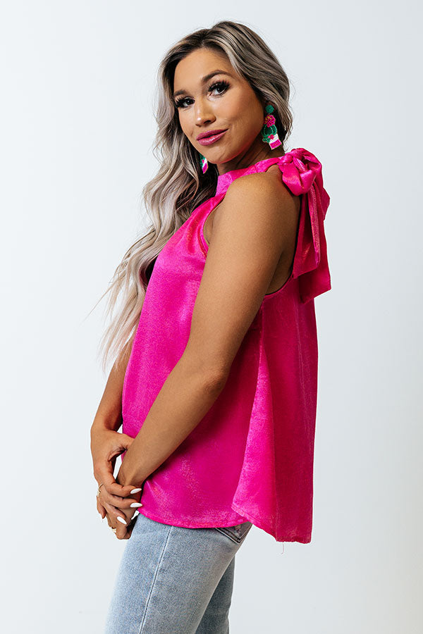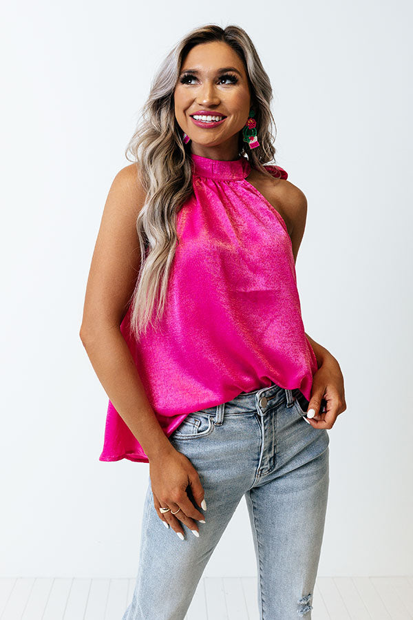Make your look memorable with this chic hot pink shift top featuring sleek lightweight material, a high neckline with a side tie closure, sleeveless shoulders with a racerback fit, and a relaxed silhouette that falls into a straight hemline! on products