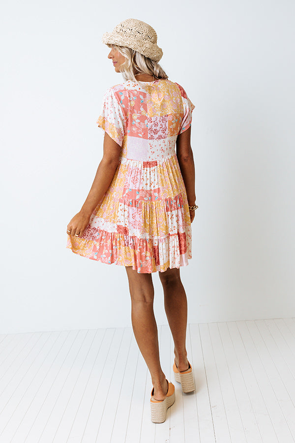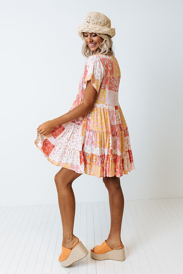 Keep your style unique with our beautiful 'Make Way For Miracles' dress featuring lightweight and breezy material patterned with floral dark coral, ivory, pink, and mustard hued patchwork, a v-cut neckline with a tie closure, short sleeves, and a relaxed babydoll silhouette that falls into a straight mid-thigh length hemline! on products