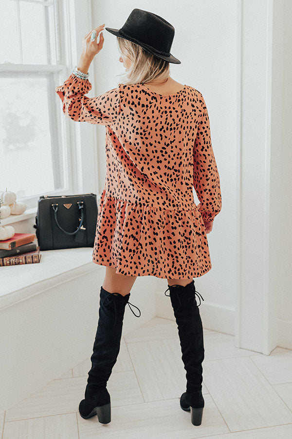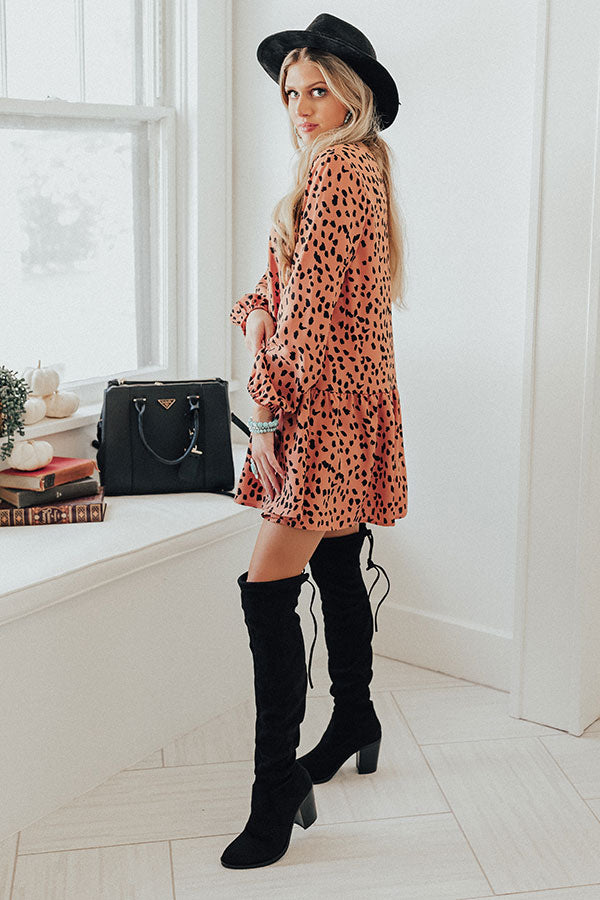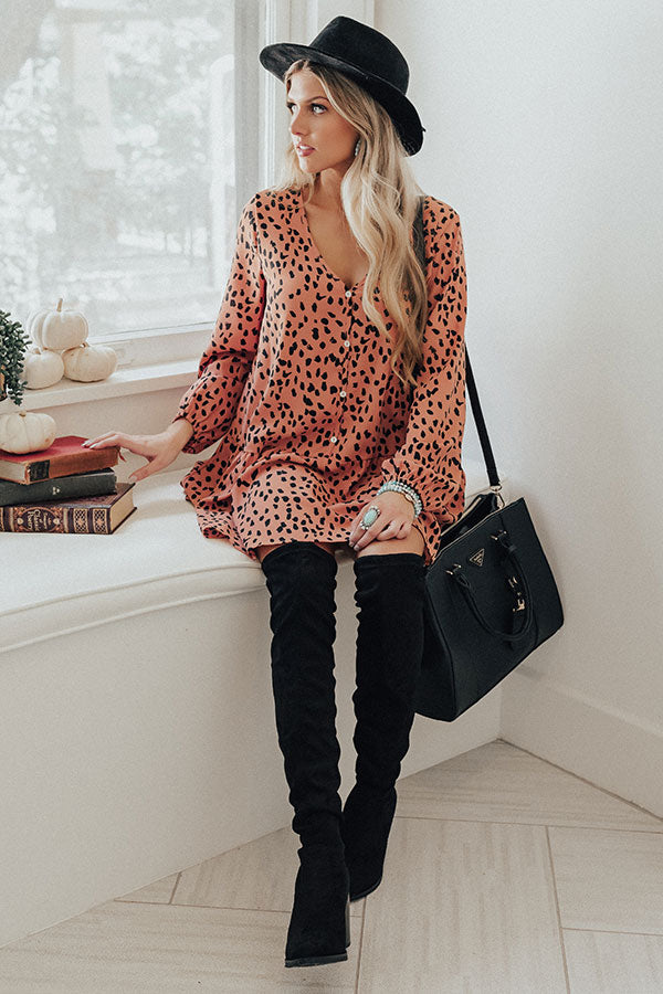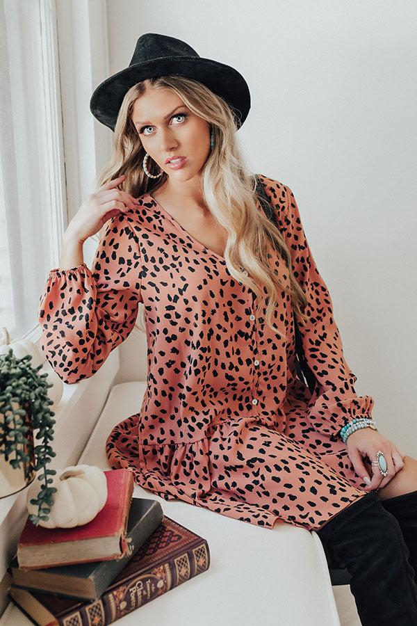 This pink hued shift dress is sure to "make a debut" this fall with its lightweight material, a bold black leopard print, a button up bodice with a v-cut neckline, long loose bishop sleeves with elastic banded cuffs, and a relaxed silhouette that falls into a peplum bottom with a straight mid-thigh length hemline! We have styled this adorable piece with a black tote, over the knee boot, and a faux suede hat, but you can also wear it with "The Seraphina Faux Leather Wedge in Grey" and our "Be Dazzled Beaded Earrings in Grey!" Measurements