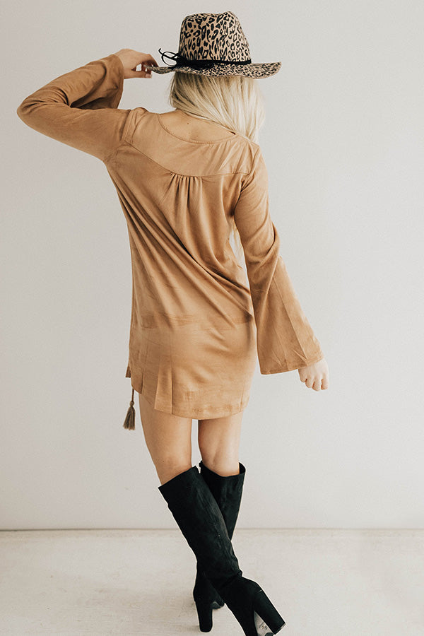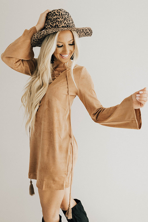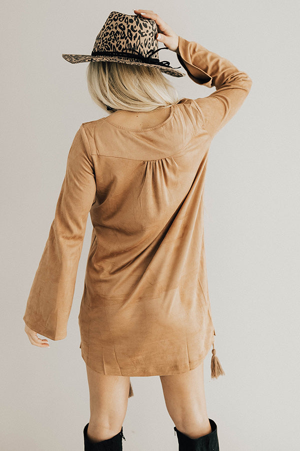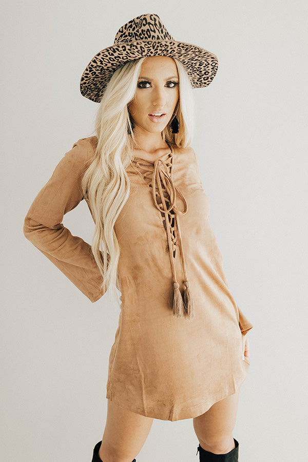 Making an Entrance Lace Up Faux Suede Shift Dress in Tan