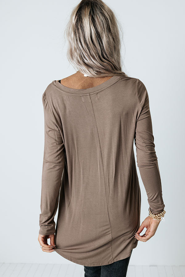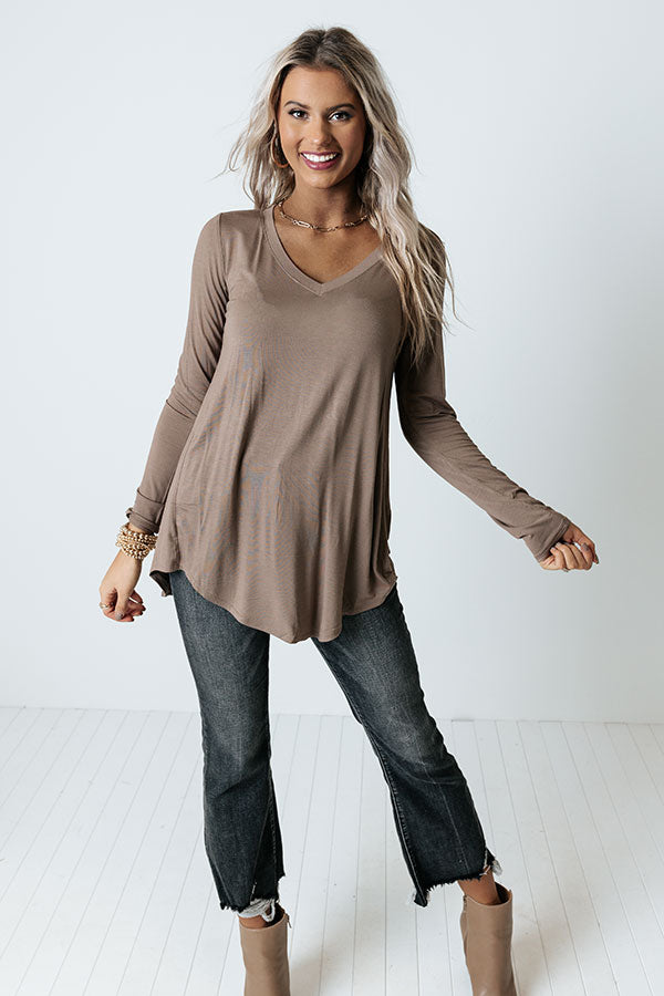 Keep your look simple but stylish with our basic taupe colored 'Making Friends Shift Top' featuring lightweight material, a v-cut neckline, long loose sleeves, and a relaxed silhouette that ends in a rounded hemline! Measurements