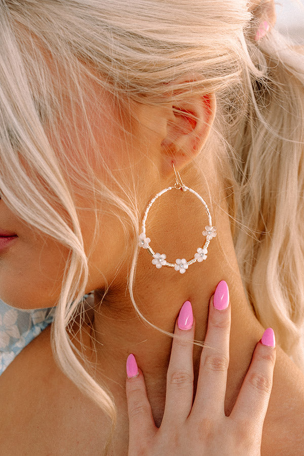 Make a grand entrance in these stunning earrings featuring dainty white beaded hoops with white beaded flower accents!