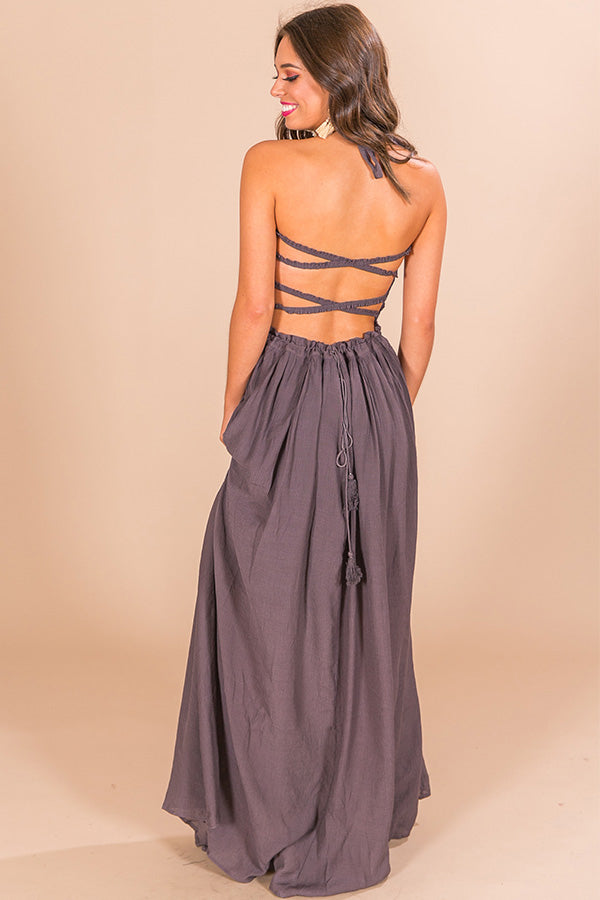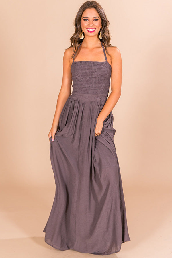 Steal the show wherever you go in the "Making Headlines Maxi Dress!" This marvelous maxi dress has a smocked elastic bodice with a halter tie neckline, a fitted waistline (that can be cinched up & tied in the back to create the perfect fit for you), a gorgeous open back with stretchy criss-cross straps & a full floor-length maxi skirt. Complete your look with a neutral heel & a great statement earring, for an effortlessly elegant look that is sure to stun!