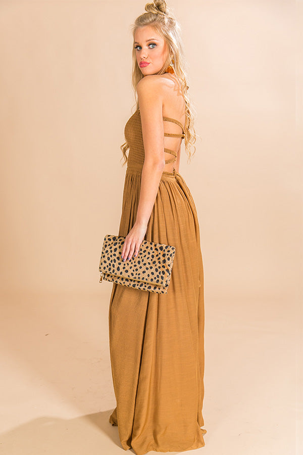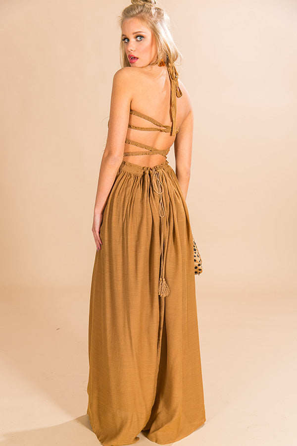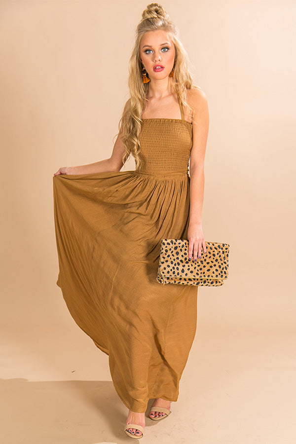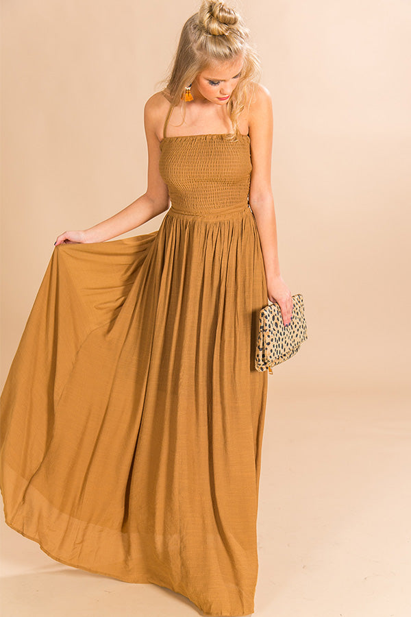 Steal the show wherever you go in the "Making Headlines Maxi Dress!" This marvelous maxi dress has a smocked elastic bodice with a halter tie neckline, a fitted waistline (that can be cinched up & tied in the back to create the perfect fit for you), a gorgeous open back with stretchy criss-cross straps & a full floor-length maxi skirt. Complete your look with a neutral heel & a great statement earring, for an effortlessly elegant look that is sure to stun!