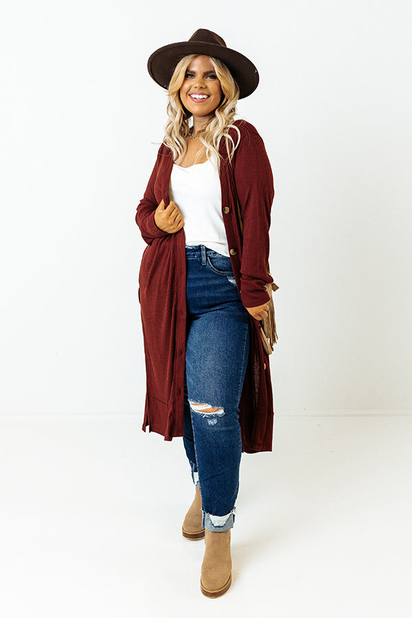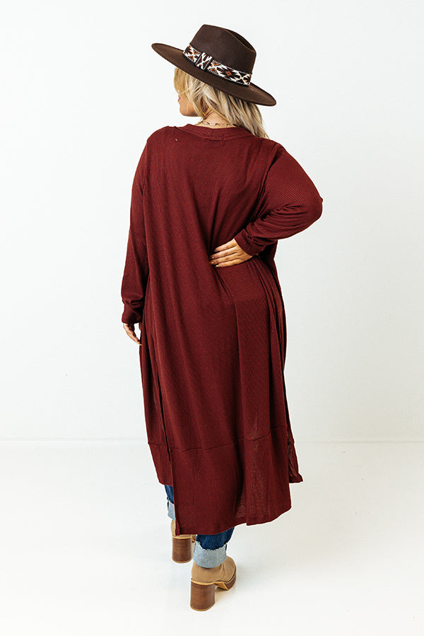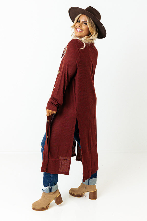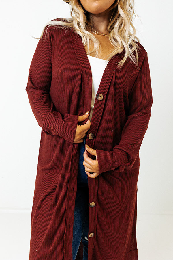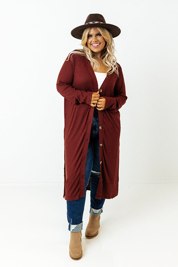 You'll be fall festivity ready in our dark rust hued 'Making Memories' ribbed cardigan! Features a lightweight knit material, v-neckline, long sleeves, and side accent slits, with the option of button up front closure or an open draping silhouette which falls to a straight calf-length hemline.