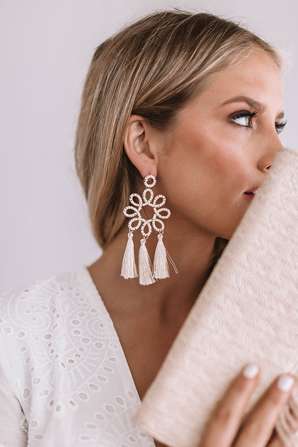 You will be "making memories" when you wear these white statement earrings featuring circle studs and a beaded flower with three dangling tassels!