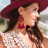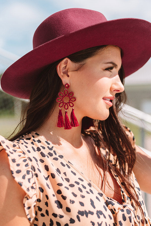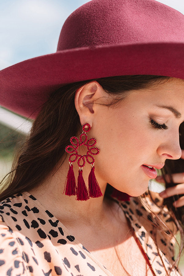 You will be "making memories" at game day when you wear these wine statement earrings featuring circle studs and a beaded flower with three dangling tassels!
