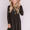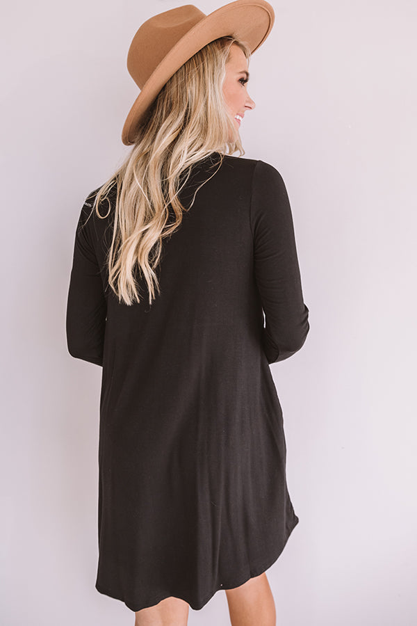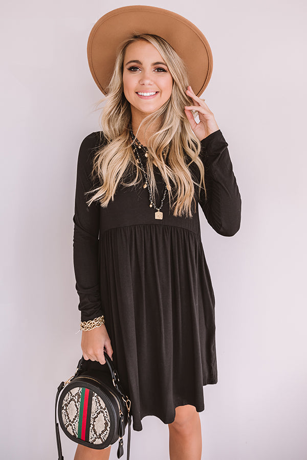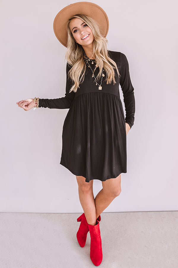 When you have finished "making plans," all you have left to do is thrown on this adorable little black babydoll dress featuring soft lightweight material, a high rounded neckline, long semi-loose sleeves with fitted cuffs, hidden side pockets, and an ultra relaxed shift silhouette that falls into an uneven mid-thigh length hemline! You can style this piece up with some red booties, a snake print crossbody, dainty jewelry, and a neutral faux suede hat, or you can dress it down by layering it under a distressed denim jacket with "The Linden Camo Sneaker!" Measurements