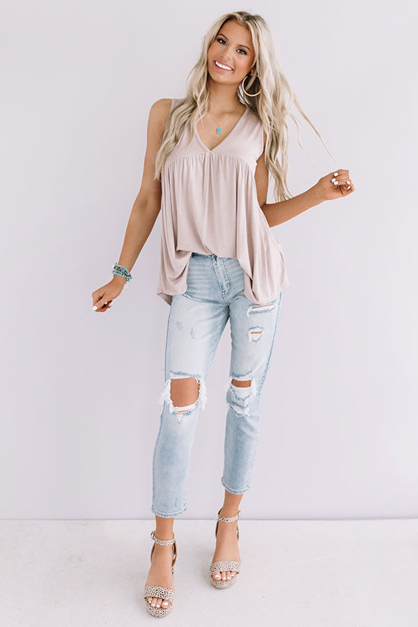 Our casual iced latte colored "Making Wishes" top is the update your wardrobe basics have been asking for with its soft lightweight shift material, a v-cut neckline, wide 3-inch shoulder straps, and an ultra relaxed babydoll silhouette that falls into a rounded hemline! You're styling options are endless with this versatile piece! It pairs perfectly solo with some distressed light wash denim, a colored clutch, and cheetah print heels, but you can also wear it layered under our "New Love Waffle Knit Cardigan in Golden Honey" with some frayed black shorts, sunnies, and "The Allen Wedge in Golden Honey!" Measurements