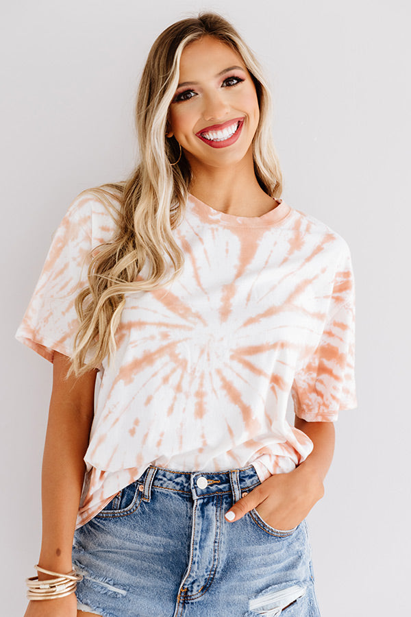 Chill out in this trendy tee featuring soft lightweight material patterned with rust colored tie dye, a high rounded neckline, short loose sleeves, and a relaxed silhouette that falls into a straight hemline! This casual cutie can be styled a variety of ways, like with some distressed denim shorts and matching white sneakers, but you can also wear it with some white flares, "The Alba Wedge in Rust," our "Corner Cafe Wool Hat in Brown," and our "Chic Harmony Fringe Tote in Brown!"