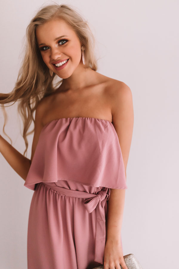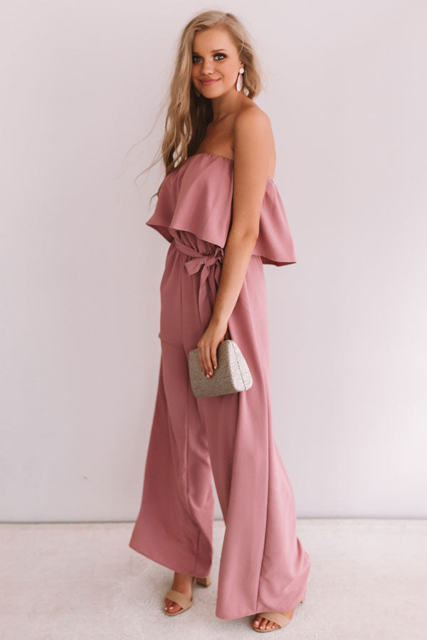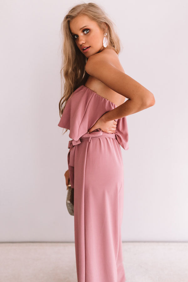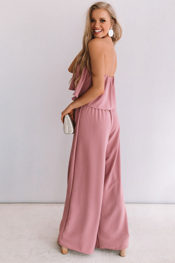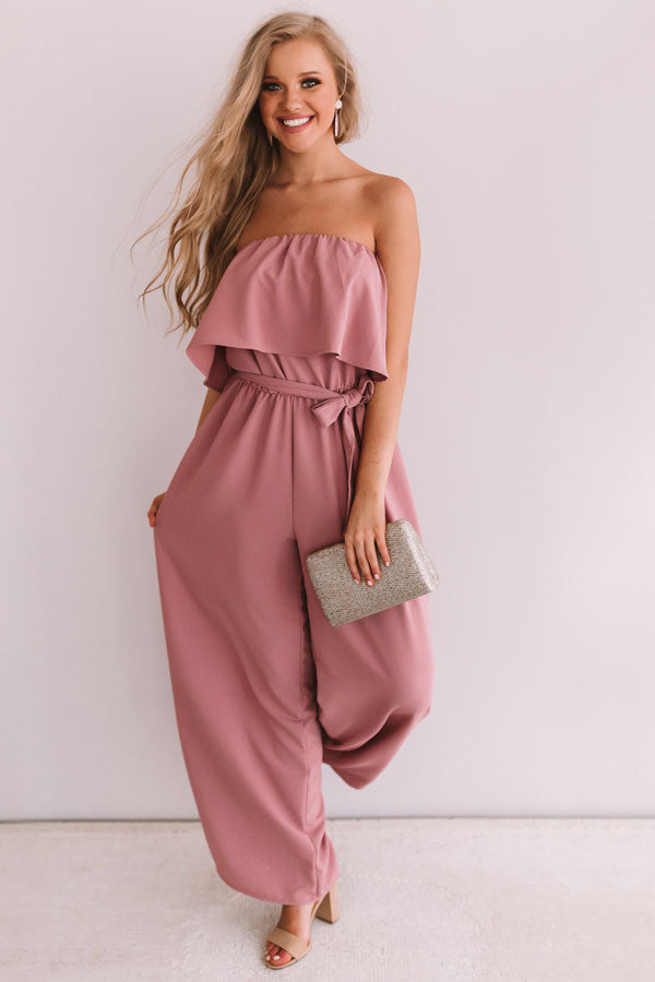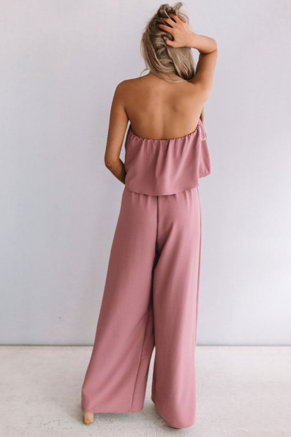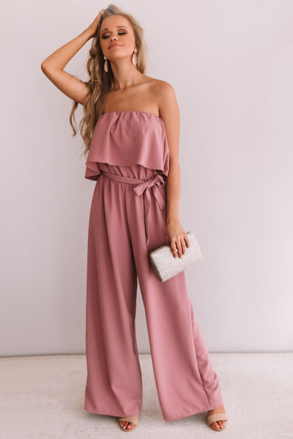 Use the world as your runway and strut your stuff in this strapless blush jumpsuit with its oversized fabric overlay and belt tie! The elastic band round the chest makes sure the jumpsuit is fitting you in all the right places and the breezy pant legs will make you feel comfortable but sophisticated! Measurements