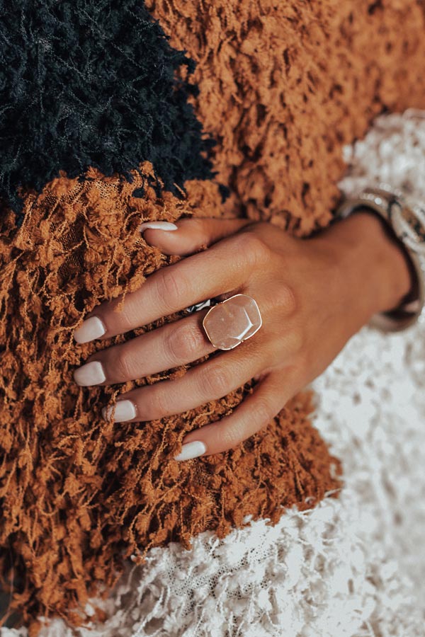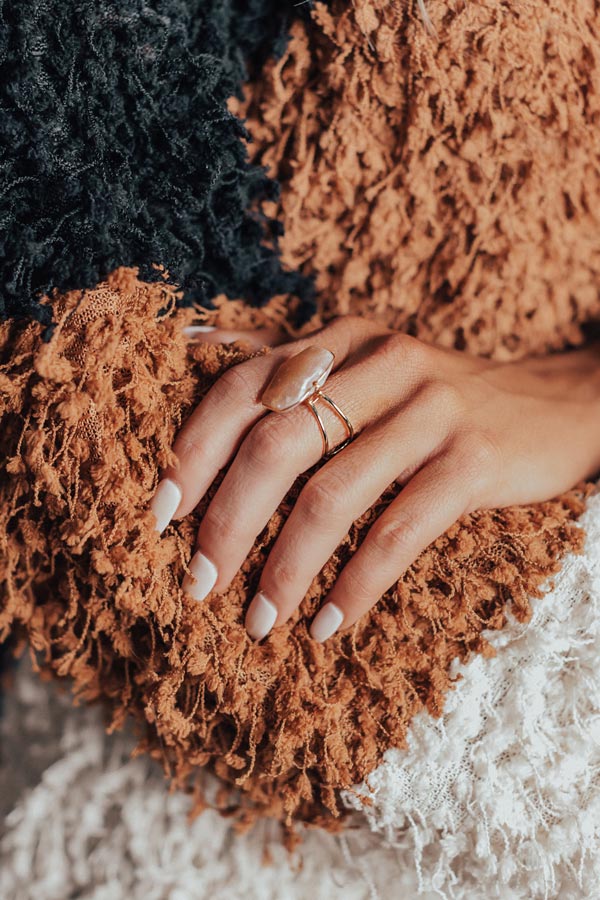 Add a glamorous flare to your OOTD by accessorizing with our "Malibu Bliss" statement ring featuring a large semi precious blush colored stone set on two dainty gold bands!