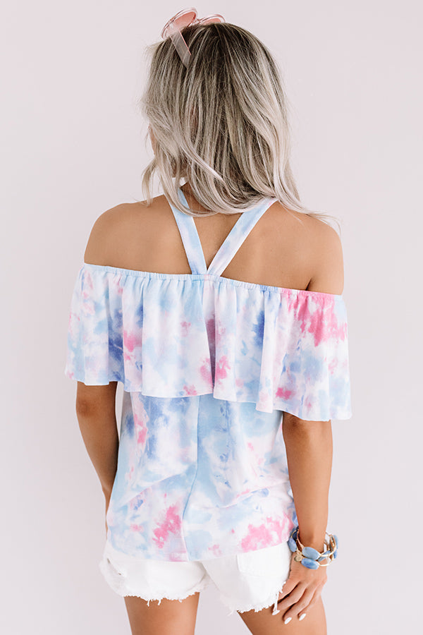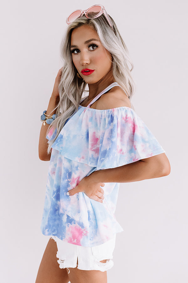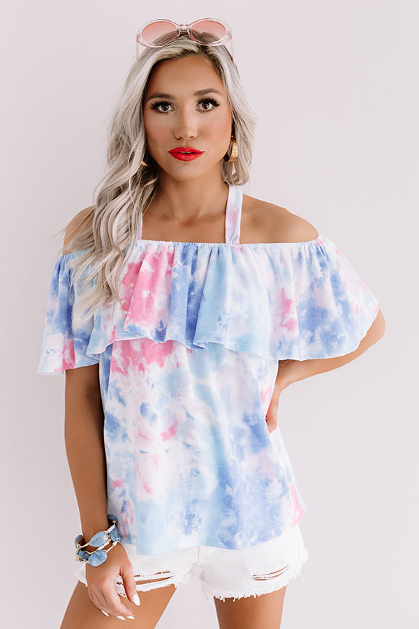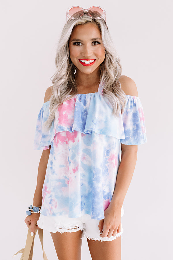 Mix up your usual style with this trendy top featuring lightweight material patterned with blue and pink tie dye, an elastic off-shoulder fit with a straight neckline, 1-inch sleeveless shoulder straps with short cold shoulder cutout drop sleeves, and a relaxed silhouette that falls into a straight hemline! We have styled this eye-catching piece with some distressed white shorts, matching sunnies, neutral heels, and a woven fringe tote, but you can also wear it with some light wash flares and "The Bowen Wedge in Blue!" Measurements