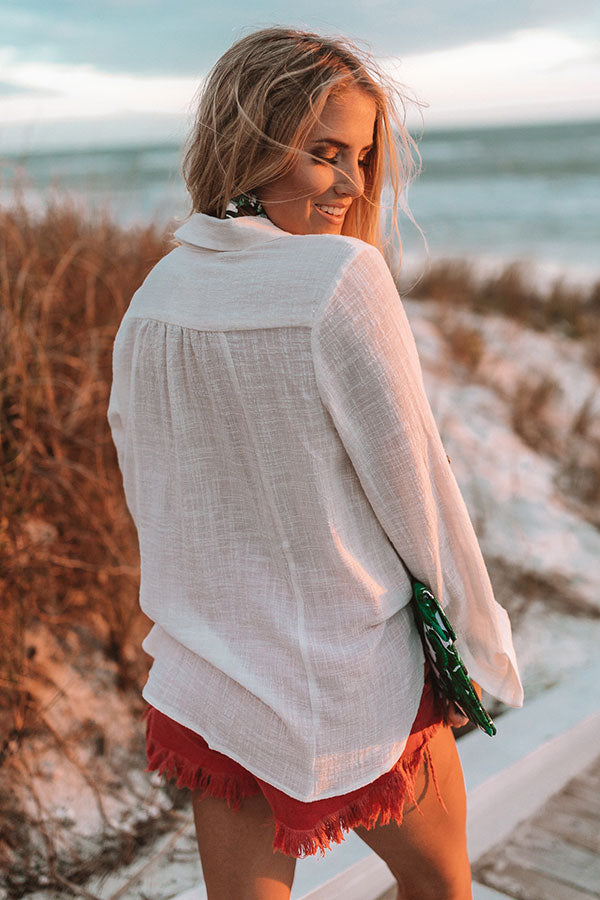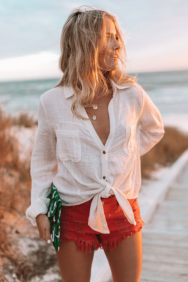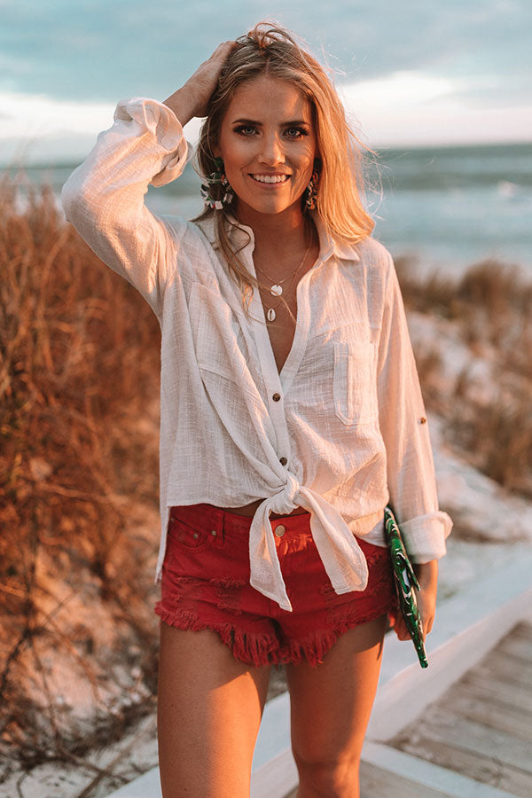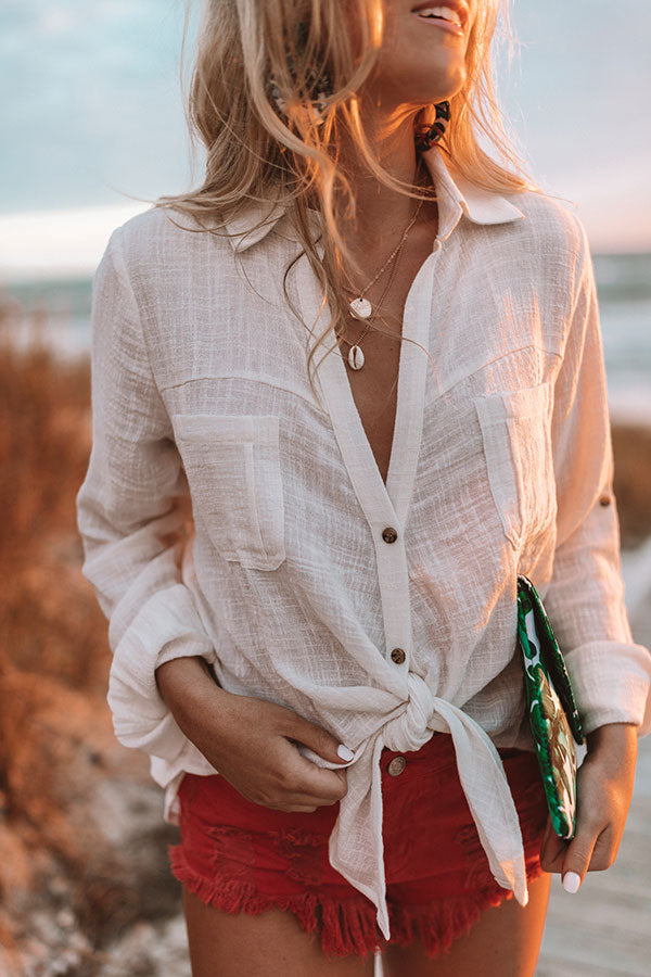 We are obsessed with this woven cotton tie top! The "Malibu Morning Shift Top" features a collared neckline, long roll-tab sleeves, front accent pockets, a lightweight linen-like cotton bodice & a trendy tie-front hem.