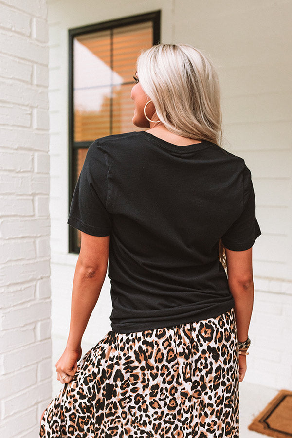 Show off your super mama powers with this adorable black tee featuring soft lightweight material with bold leopard print block lettering on the front, a high rounded neckline, short loose sleeves, and a relaxed silhouette that falls into a straight hemline that can be knotted! You can style this casual cutie a variety of ways, like layered under a denim jacket with a leopard skirt and trendy sneakers, but you can also wear it solo with some distressed ankle skinnies, "The Allen Wedge in Black," sunnies, and our "Luxe Experience Leopard Tote!" Measurements