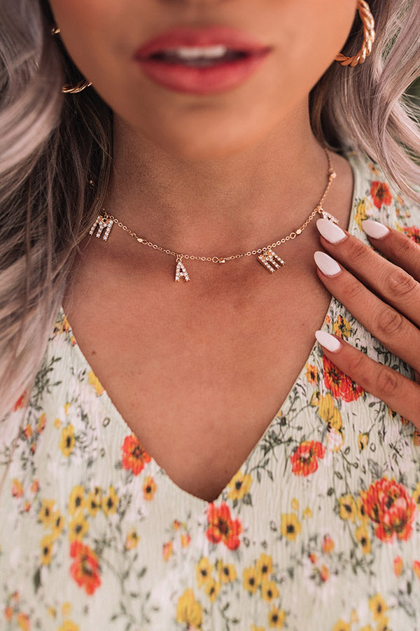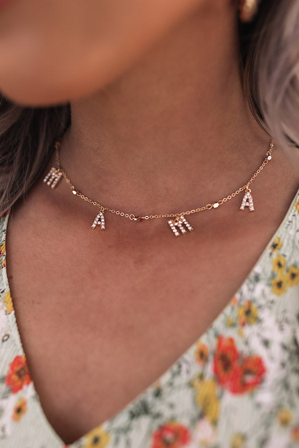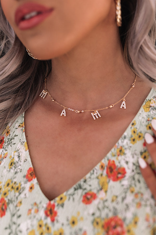 Treat yourself or your mom with this beautiful necklace featuring a dainty chain with tiny gold bead accents and rhinestone letter charms that spell MAMA!