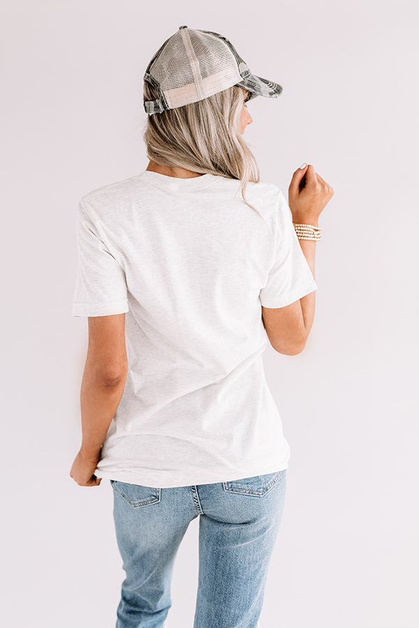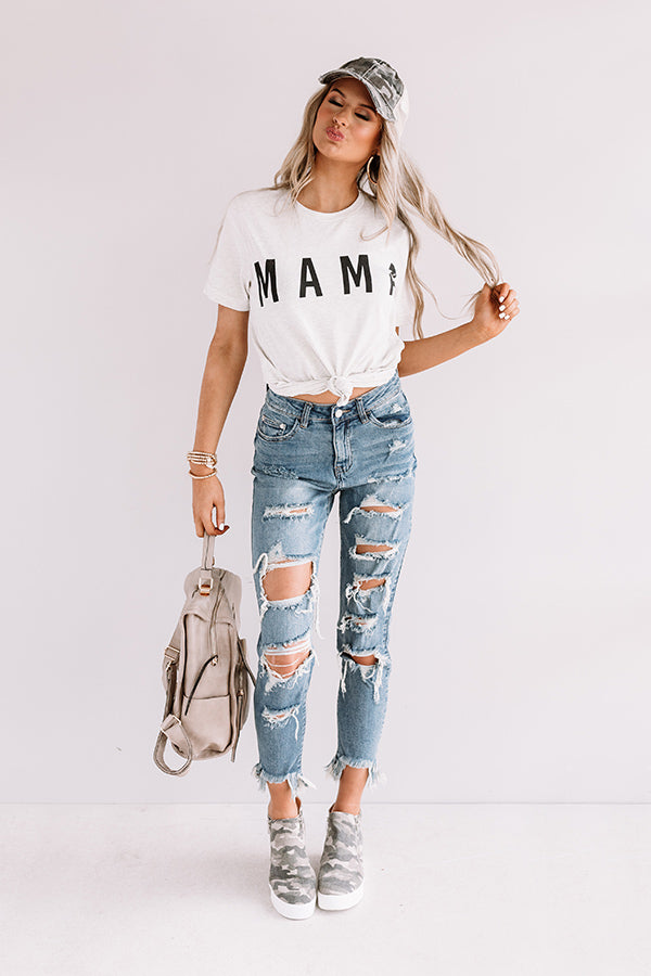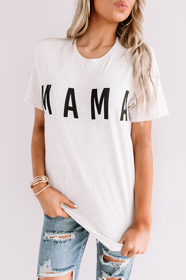 Keep it casual but chic in our birch colored "Mama Shift Tee" featuring soft lightweight material, a high rounded neckline, short loose sleeves, large black block lettering on the front, and a relaxed silhouette that falls into a straight hemline that can be knotted! You can style this cutie a variety of ways, like dressed down with some ultra distressed ankle skinnies, a neutral faux leather backpack, and a camo baseball cap and wedged sneaker, but you can also dress it up with our "Side Hustle High Waist Pants in Olive," "The Allen Wedge in Black," and our "Sugar Beach Sunnies in Black!" Measurements