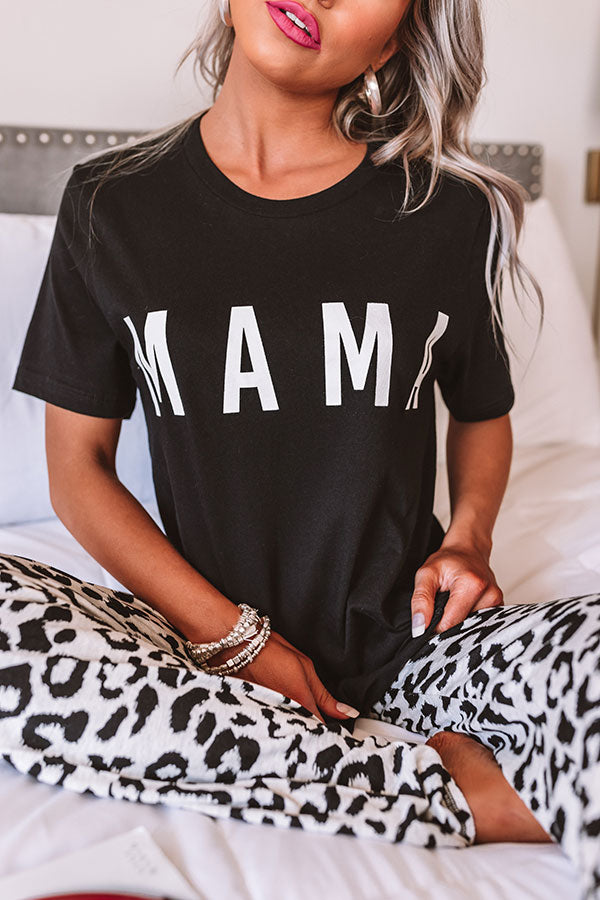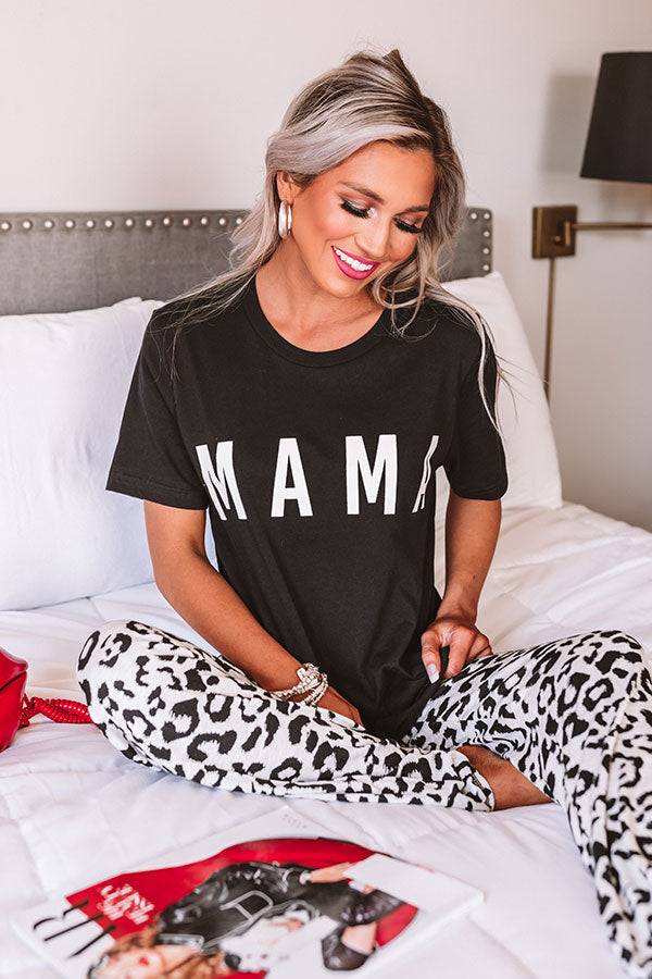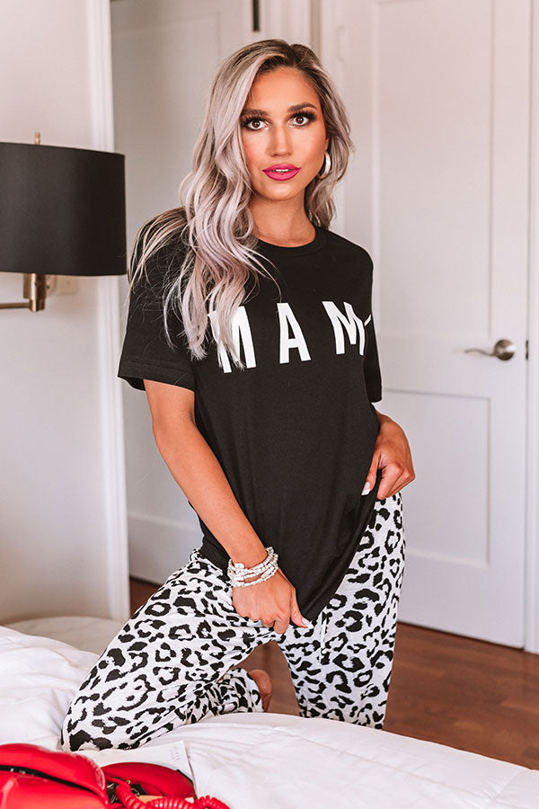 Keep it casual but chic in our black "Mama Shift Tee" featuring soft lightweight material, a high rounded neckline, short loose sleeves, large white block lettering on the front, and a relaxed silhouette that falls into a straight hemline! You can style this cutie a variety of ways, like dressed down with some trendy leopard joggers, or you can also dress it up with our "Side Hustle High Waist Pants in Olive," sunnies, "The Allen Wedge in Black," and our "Swiss Alps Getaway Backpack in Black!"