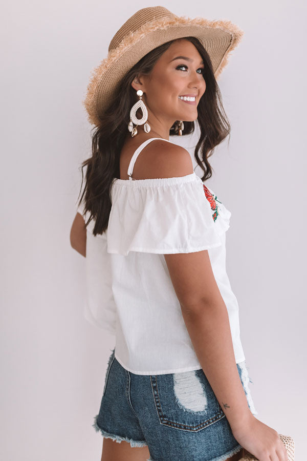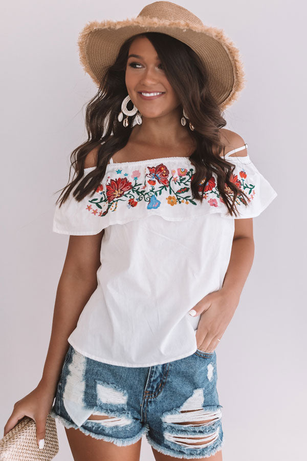 All you need for the perfect afternoon on the patio or in paradise is a frozen margarita, tacos, and this fabulous off the shoulder top! It has thin adjustable straps, a flirty flounced neckline that is decorated with gorgeous floral embroidery, and a breezy cotton bodice. So grab your sunnies and a sun hat and escape to Margaritaville!