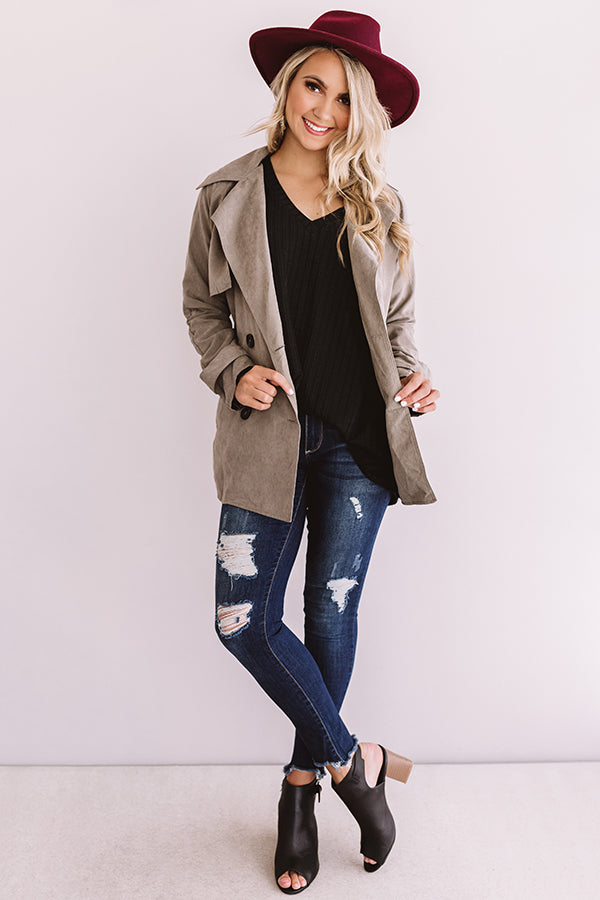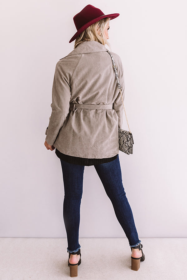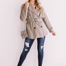 This chic taupe jacket is sure to protect you from that chilly "Manhattan breeze" with its soft lightweight material, long loose sleeves with strapped cuffs, wide collar with notched front flaps, four button closure, accent side pockets, a straight hemline and a relaxed silhouette with a waist belt! Your styling options will be endless all your round with this fall outer piece! It is the perfect layering option, whether you style it over a basic tank with a wedge and crossbody, or with a sweater, booties, and a faux suede hat! Measurements