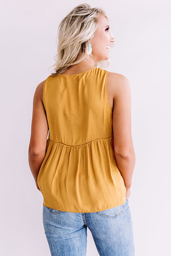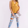 When headed out with the girls on those fall "Manhattan nights," stay looking chic with this mustard colored top featuring lightweight satin material, a wrapped bodice with a v-cut neckline, sleeveless 1-inch shoulder straps, and a relaxed babydoll silhouette that falls into a straight hemline! We have styled this upscale basic with some distressed ankle skinnies, a simple neutral heel, and a snake print clutch, but you can also wear it under a distressed denim jacket with our "Weekend In NYC Ribbed Velour Skirt in Black," "The Knox Leopard Bootie," and "The Jonas Hat in Black!"