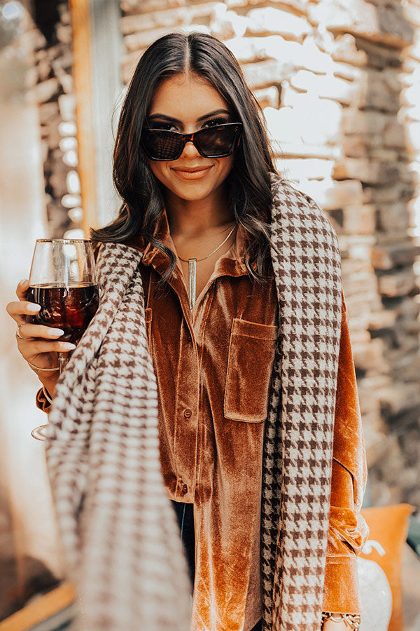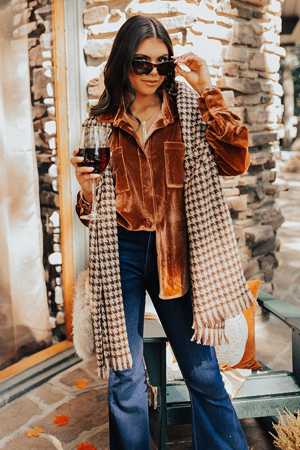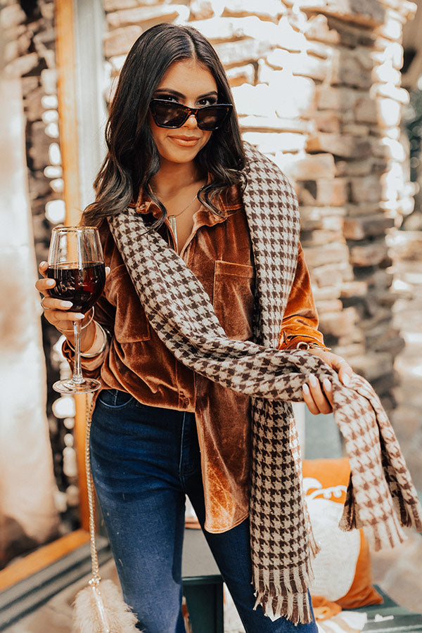 The perfect fall outfit completer, our luxe 'Maple Grove Scarf' featuring warm brown houndstooth print knit material and fringe trim detailing!