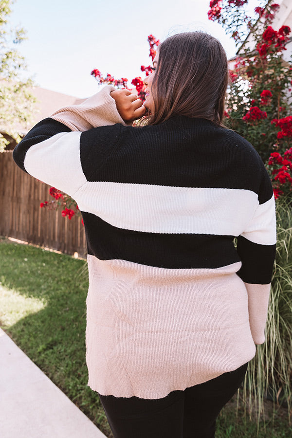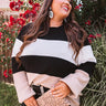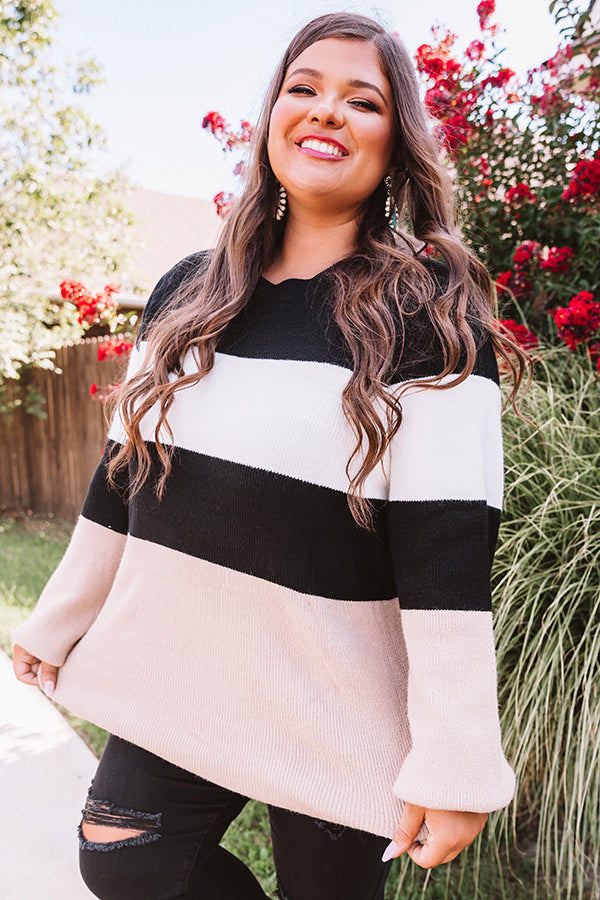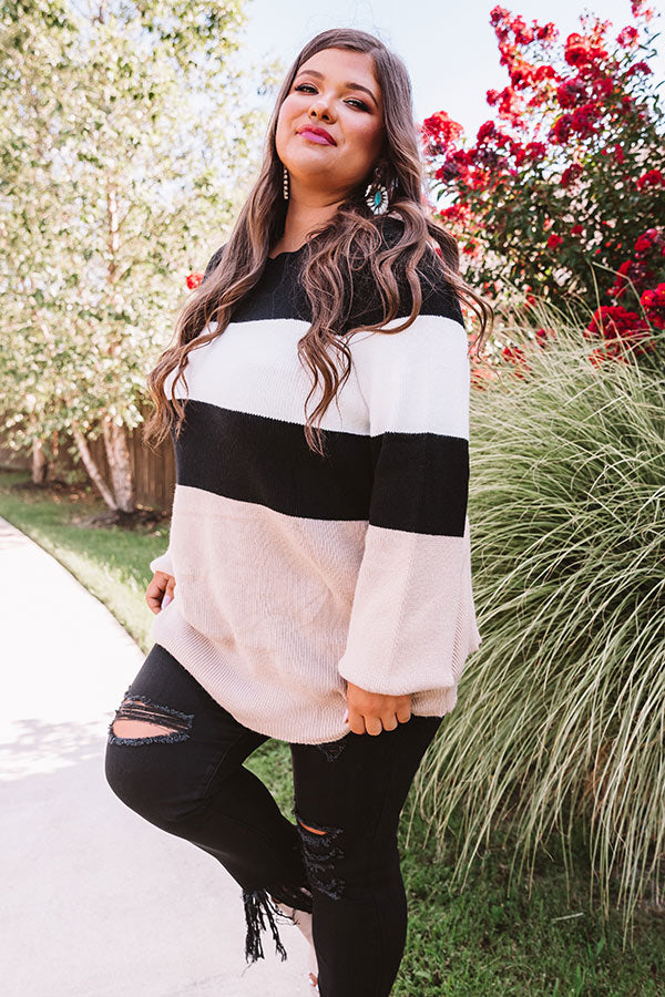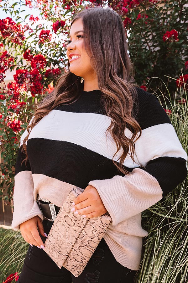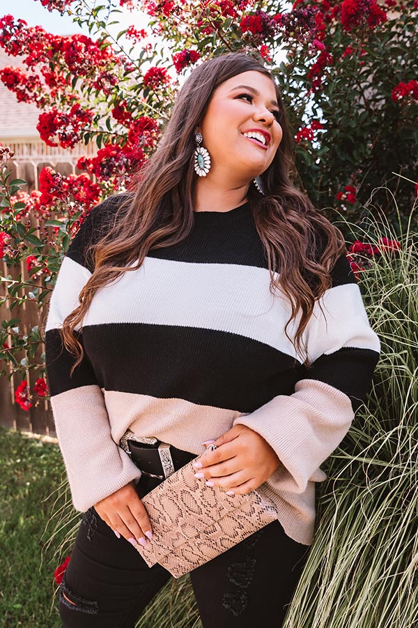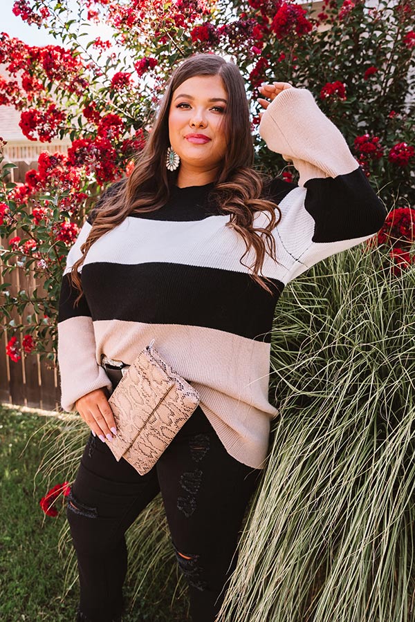 Plus Size - Stay protected from the crisp fall air in our adorable "Maple Kisses" sweater featuring ultra soft lightweight tight knit material patterned with wide horizontal black, white, and neutral stripes, subtle ribbed texturing, a high rounded neckline, long loose sleeves with fitted cuffs, and a relaxed silhouette that falls into a straight hemline! This closet essential styles perfectly with some distressed black skinnies, a snake print clutch, and a matching statement belt, but you can also wear it with some denim flares, our white "Estelle Bootie," and our "Merlot Nights Hat in Black!" Measurements