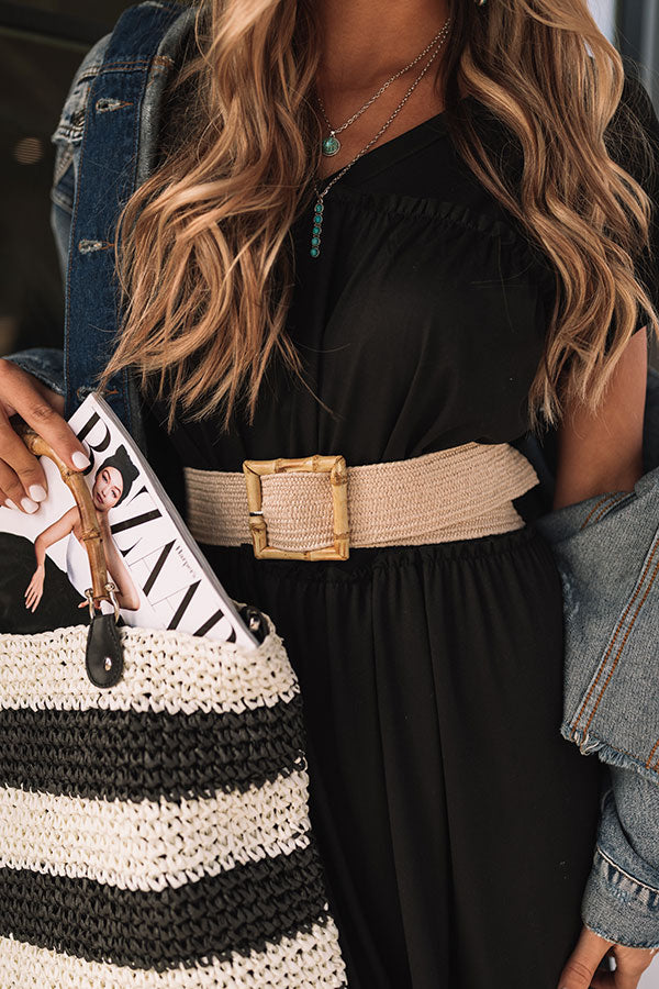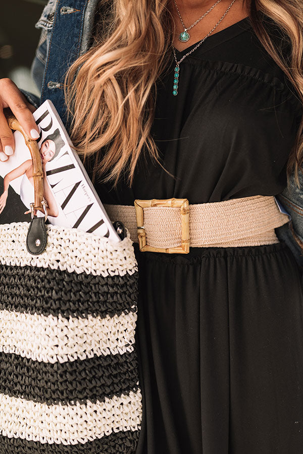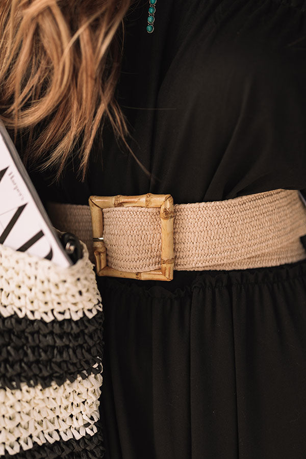 Take your summer look to the next level with our trendy 'Marco Island' belt featuring a wide woven ivory colored strap with an oversized square bamboo like buckle!