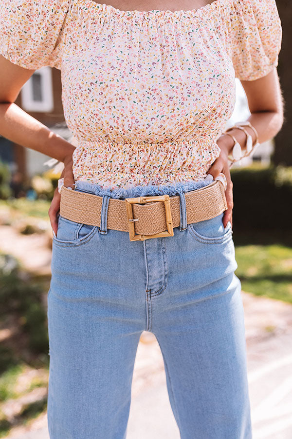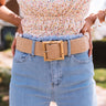 Take your summer look to the next level with our trendy 'Marco Island' belt featuring a wide woven tan colored strap with an oversized square bamboo like buckle!