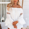 Meet all your fave gal pals for margaritas in this charming white top featuring lightweight material with crochet detailing throughout, a straight elastic off-shoulder neckline, loose 3/4-length sleeves with crochet detailing around the upper arms and tiered lace trim bell sleeves, and a relaxed silhouette that falls into a straight lace hemline!