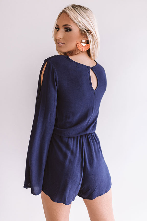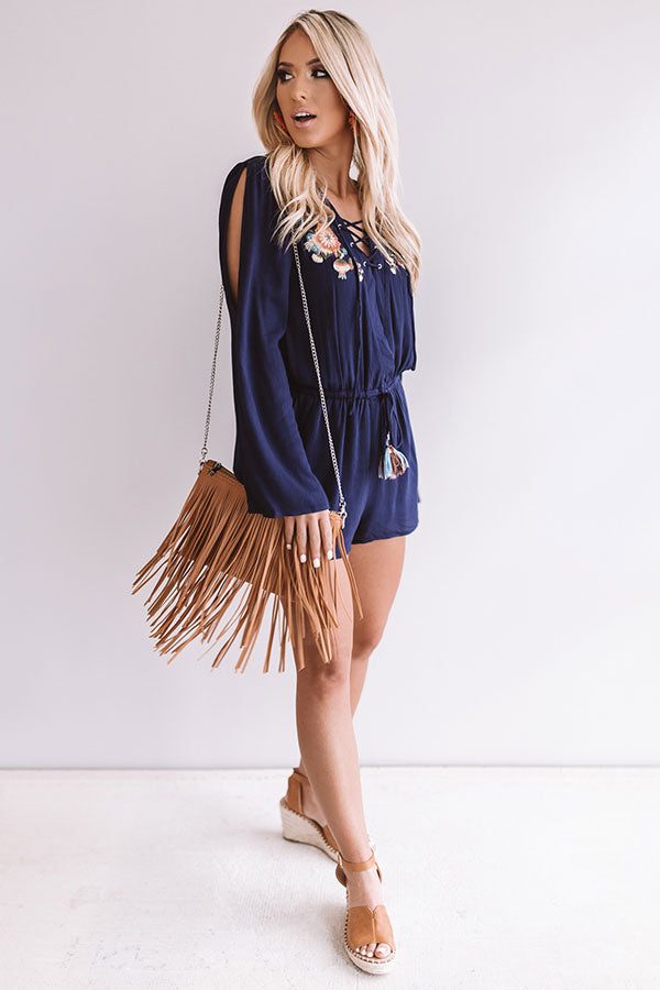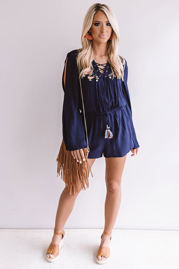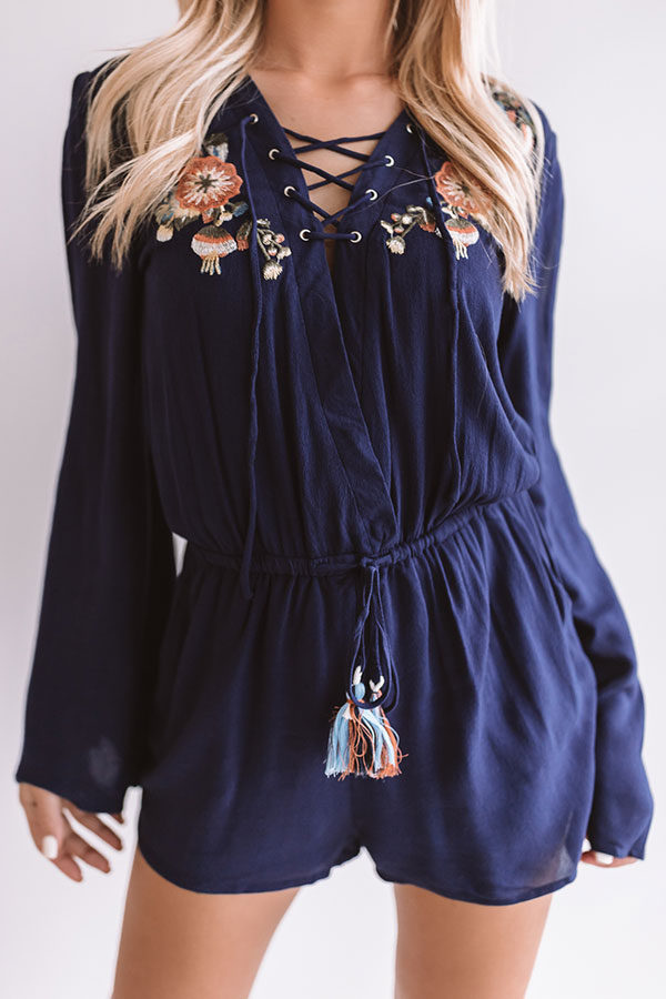 Enjoy a concert in the park or a margarita on the patio in this chic romper! This boho babe has long bell sleeves, a floral embroidered surplice bodice with a lace-up neckline, an elastic banded waistline with tasseled tie & a breezy rayon short with side pockets. Complete your look with a strappy block heel for a chic look with boho flair!
