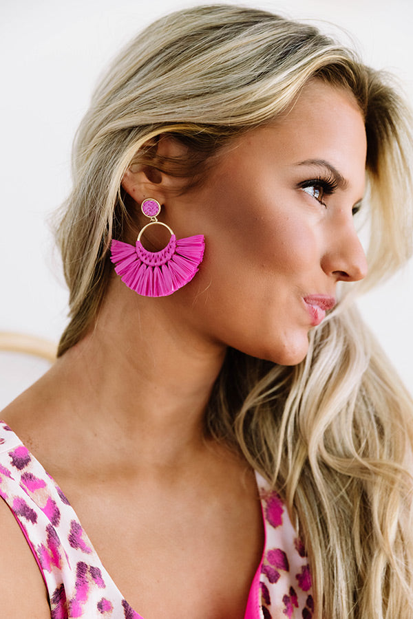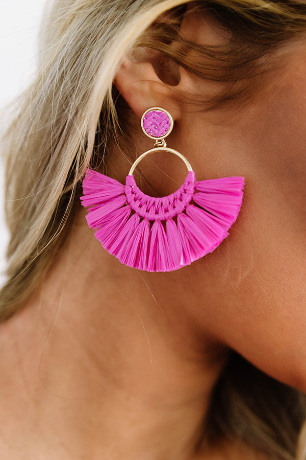 Stay looking stylish white enjoying "margs in the Maldives" by accessorizing with these adorable statement earrings featuring circle studs and dangling dainty gold hoops with woven fuchsia colored tassel fans!