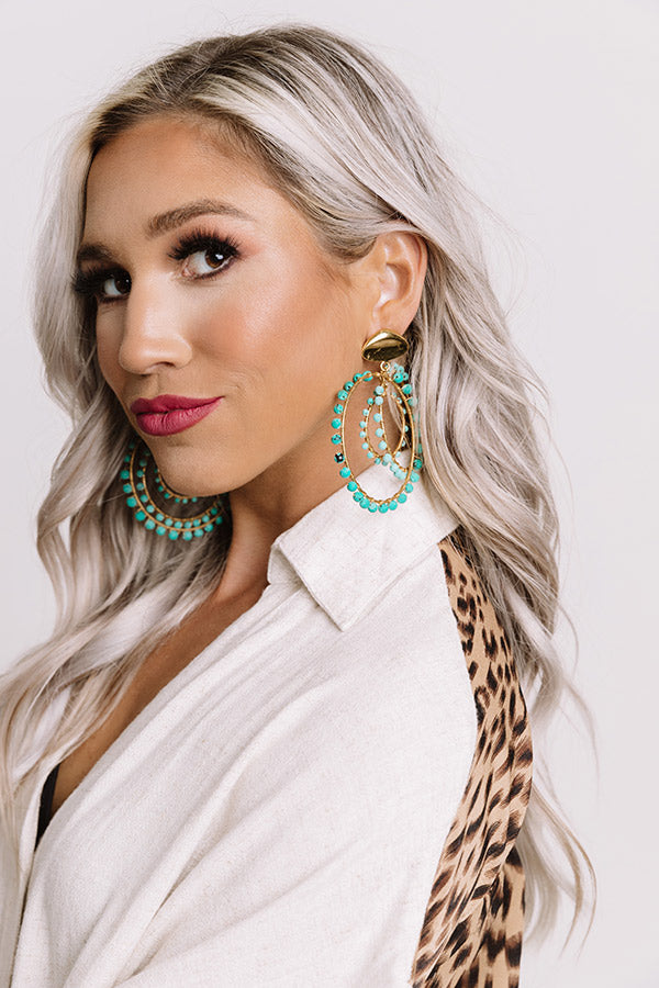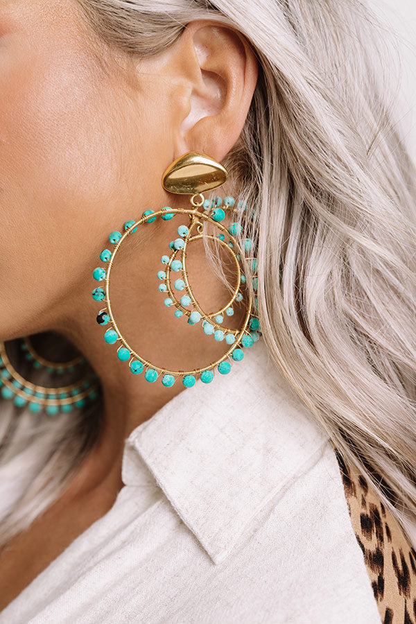 The stunning "Maria" statement earrings are composed of brass with 14k gold plating geometric posts featuring three hoops wrapped with semi-precious turquoise stones!