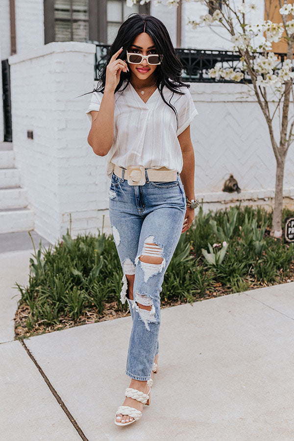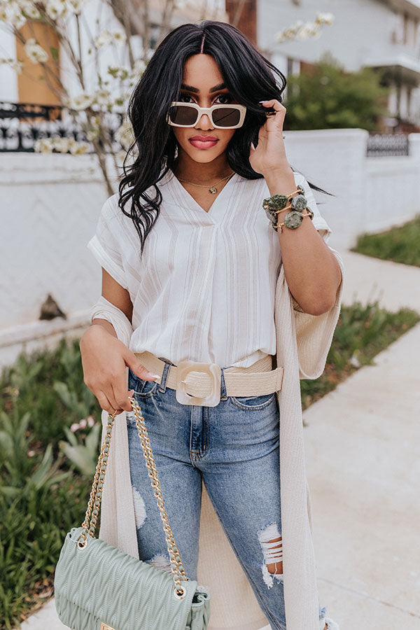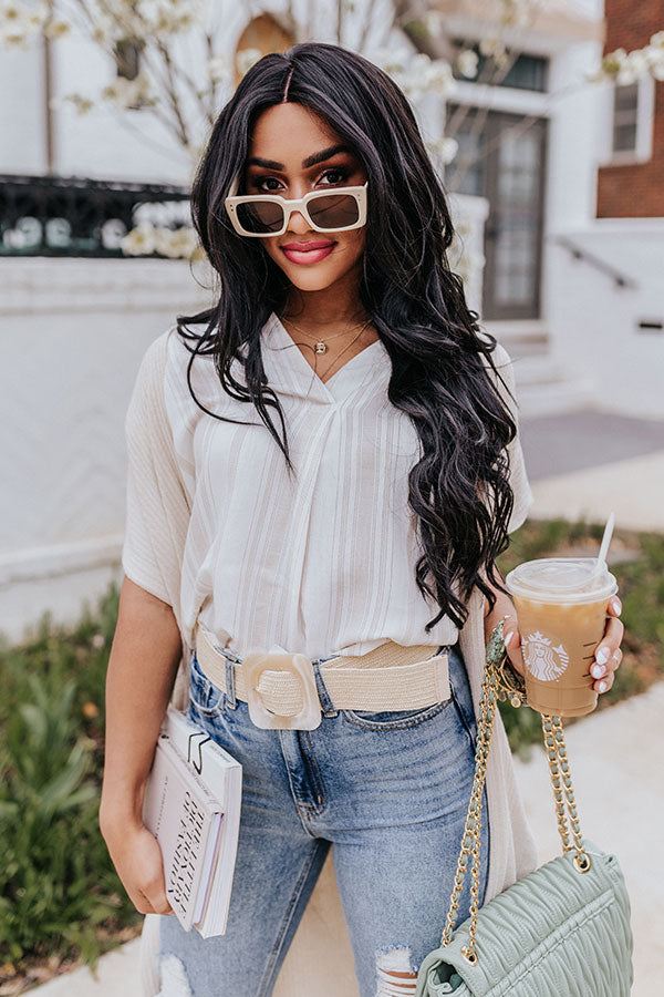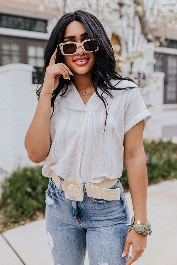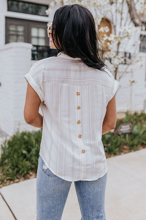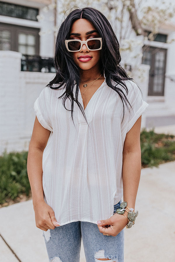 Add a luxe piece to your wardrobe with our chic white 'Marina Bay' top featuring lightweight and flowy material patterned with vertical birch colored accent stripes, a collared v-cut neckline, short sleeves, a button down back, and a relaxed silhouette that falls into a rounded hemline!