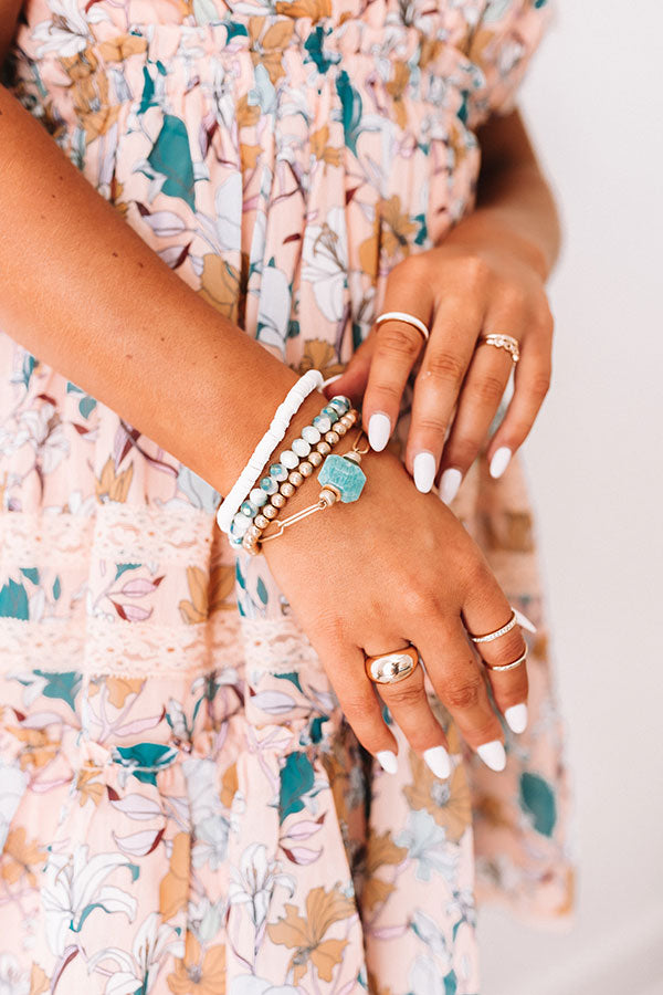 Upgrade your arm candy with our pretty 'Marina' bracelet set featuring four pieces ranging from white disc beads, ocean wave and white circle beads, gold beads, and a dainty chain with a square ocean wave stone accent!