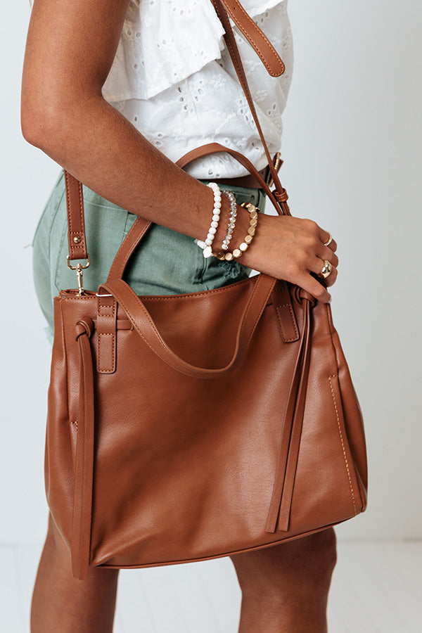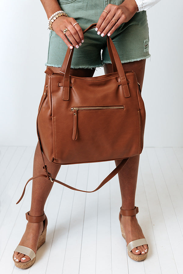 Mark our words...this brown tote is going to be loved by fashionistas everywhere! It features lightweight faux leather material, two short handles and a removable and adjustable shoulder strap, a zip closure outside back pocket, and a spacious fully lined pouch with a zip closure and additional inside pocket!