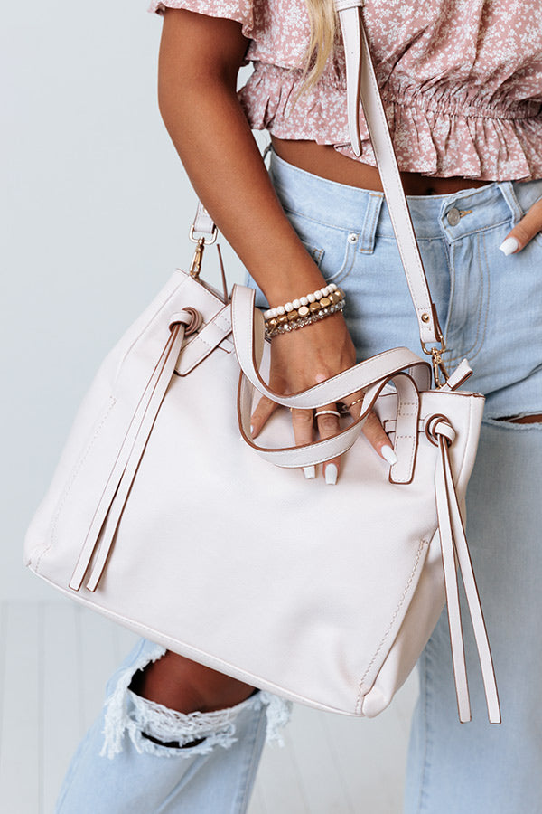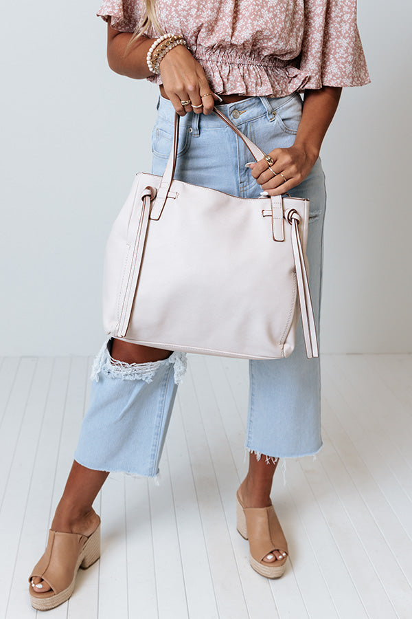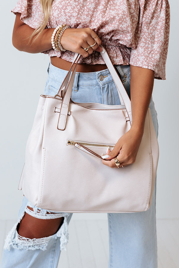 Mark our words...this stone colored tote is going to be loved by fashionistas everywhere! It features lightweight faux leather material, two short handles and a removable and adjustable shoulder strap, a zip closure outside back pocket, and a spacious fully lined pouch with a zip closure and additional inside pocket!