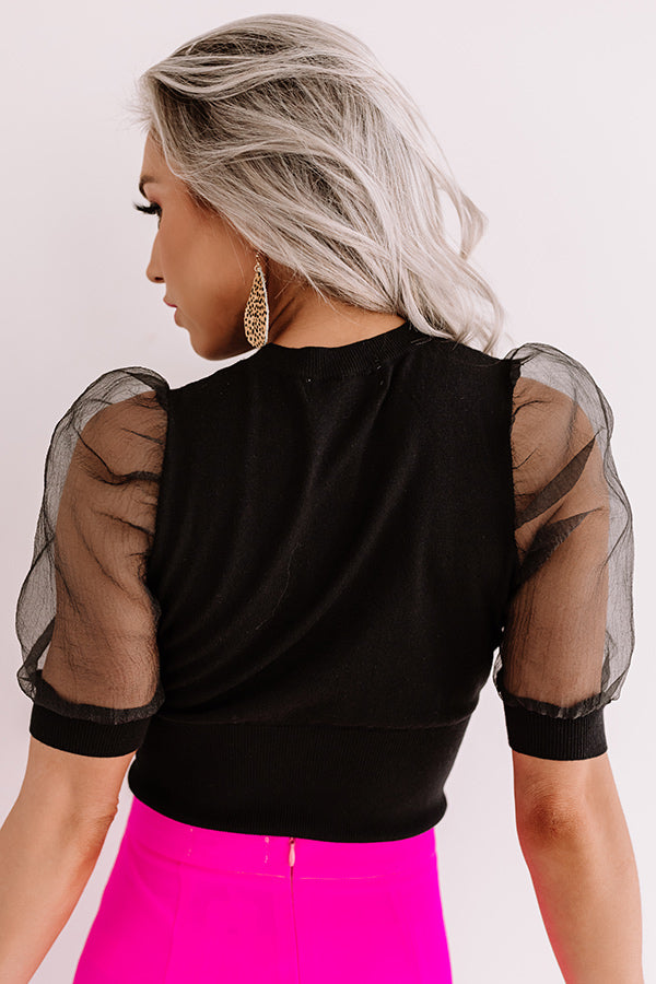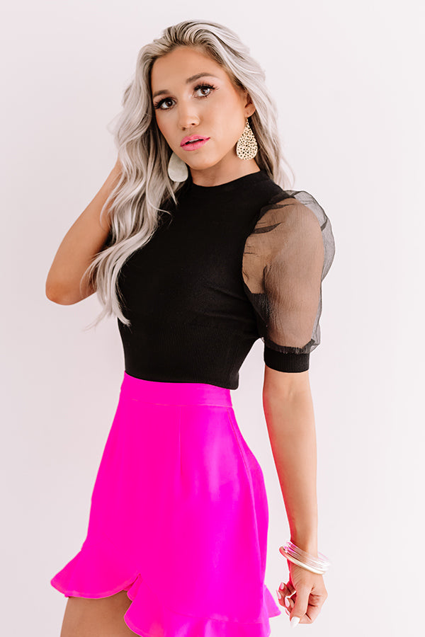 "Mark our words"... this top will sell out! You are sure to LOVE this chic black piece with its lightweight but stretchy material, high rounded neckline, ultra puffy semi-sheer short sleeves with fitted cuffs, and a form fitting silhouette that falls into a straight hemline! We have styled this beauty with a hot pink mini skirt and cheetah print heels for a more elegant look, but you can also wear it with some distressed ankle skinnies, "The Rosella Wedge in Black," sunnies, and our "Cambridge Kisses Faux Leather Tote in Black" for a more street style OOTD! Measurements